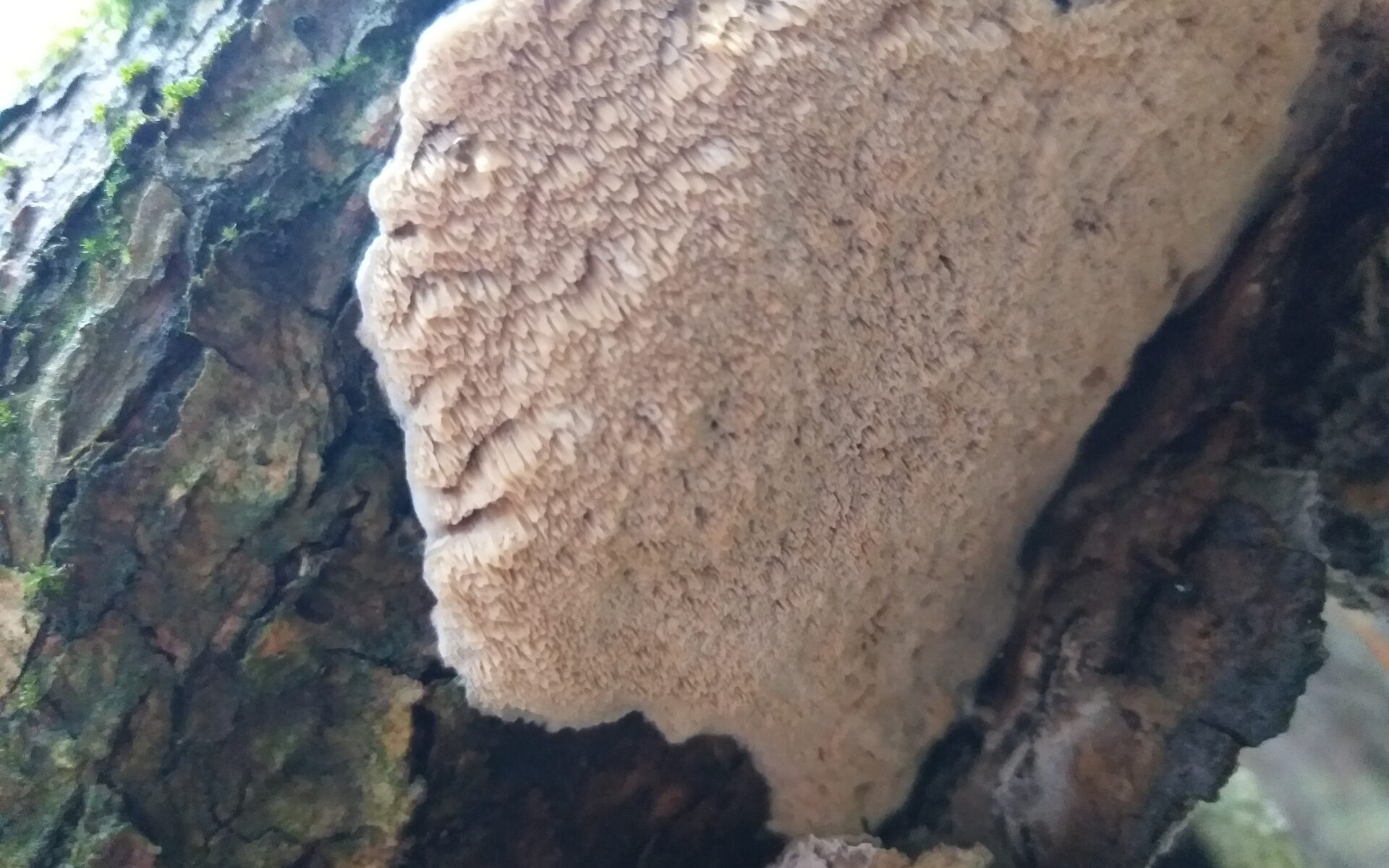 Поверхность гименофора неровная, бугристая, у молодых плодовых тел беловатая или кремовая, иногда с розовато-телесным оттенком, с возрастом становится бежевато-серой или буровато-серой, с белёсым налётом, который легко стирается при прикосновении и, судя по всему, постепенно смывается дождями, потому что у старых плодовых тел она желтовато-коричневая. Край стерильный.