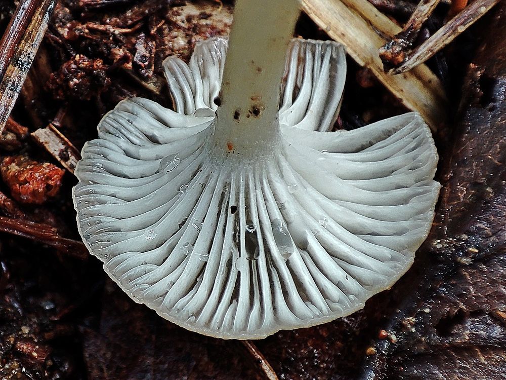 Пластины: около 2 мм шириной, сильно низбегающие, редкие и относительно толстые, иногда вильчатые у ножки. С большим количеством промежуточных пластиночек, в возрасте с поперечными прожилками.