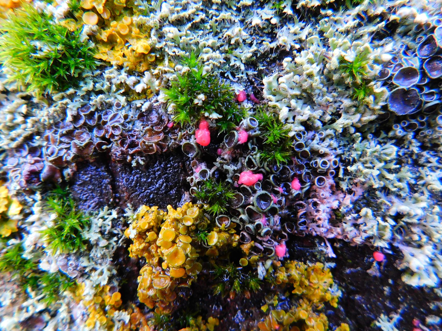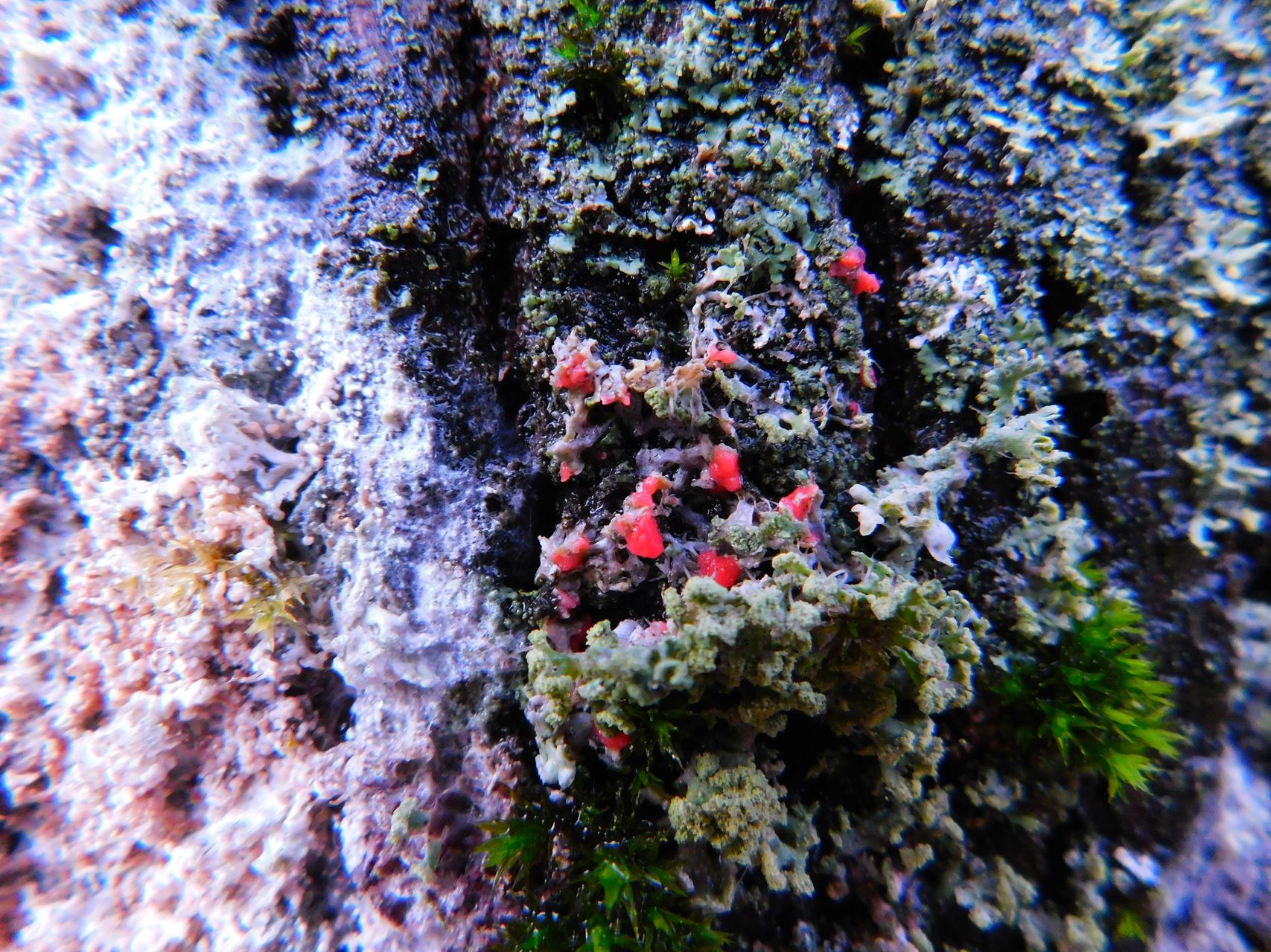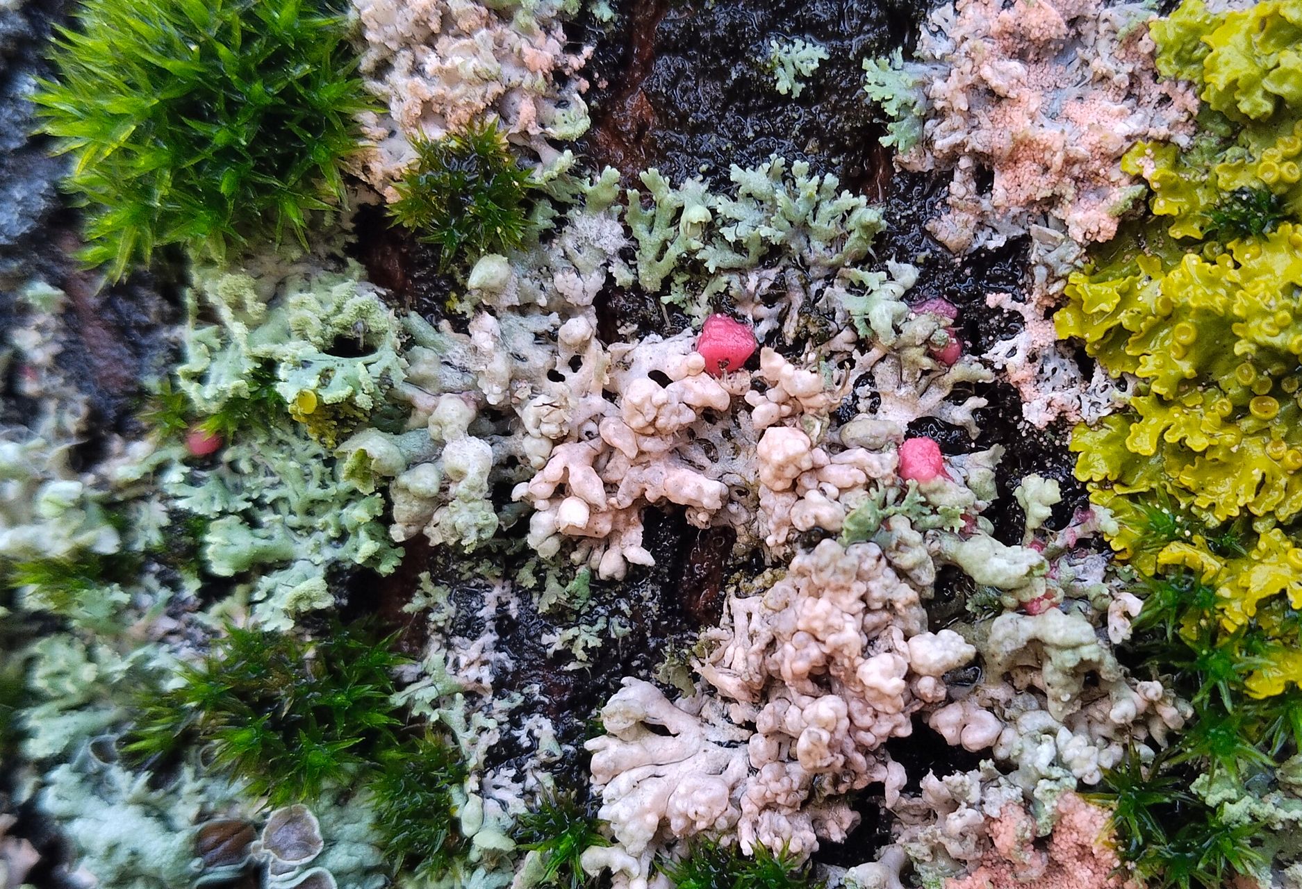 На поверхности поражённого лишайника гриб формирует хорошо заметные невооружённым глазом образования — спородохии. Это плотные скопления спор, похожие на капли или подушечки. Каждое такое образование (спородохий) достигает 0.5–1 мм в диаметре и может сливаться с соседними в более крупные «блобы», пятна до 1–2 см. Они выглядят как мелкие, бархатистые или мучнистые подушечки ярко-розового, кораллово-красного или фуксиевого цвета.