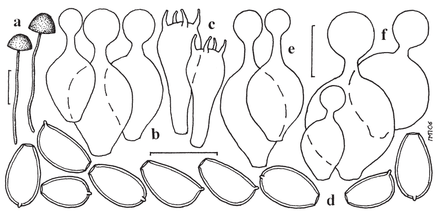 Conocybe juniana (Velen.) Hauskn. et Svrček var. subsejuncta Hauskn.: a – fruit-bodies, b – cheilocystidia, c – basidia, d – spores, e – pileocystidia, f – caulocystidia.