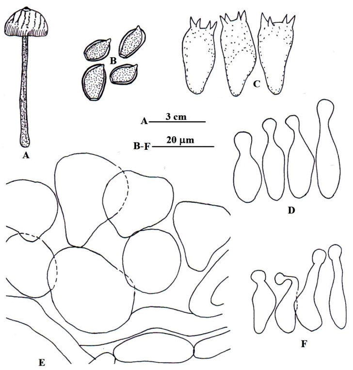 Conocybe magnicapitata. A. Carpophore; B. Basidiospores; C. Basidia; D. Cheilocystidia; E. Pileal elements; F. Caulocystidia.