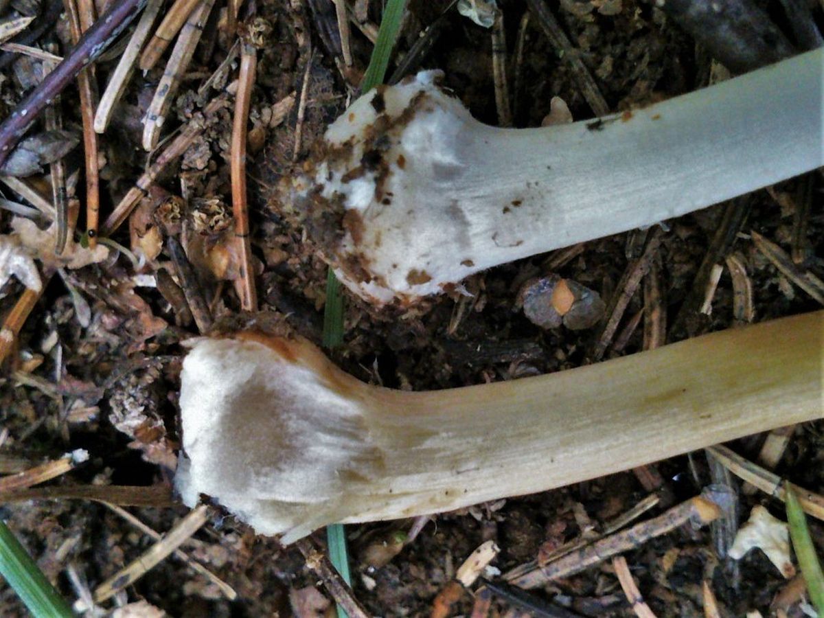 Ножка: высотой 45 – 85 мм и толщиной 2 – 4 мм. Слегка сужается кверху, с бульбообразным основанием шириной до 7 мм, центральная, полая, опушенная до слегка волосистой, белая, позже беловатая или с желтоватым оттенком.