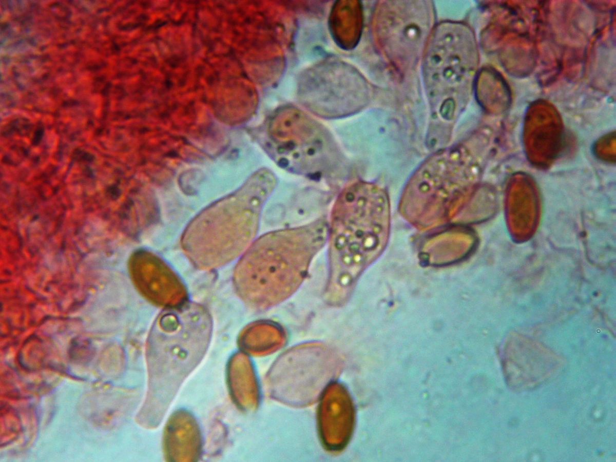 Хейлоцистидии 19,0–31,0 × 8,5–11,5 мкм, лецитиформные, шейка до 5,0 × 1,5 мкм, головка 4,0–5,0 мкм шириной.