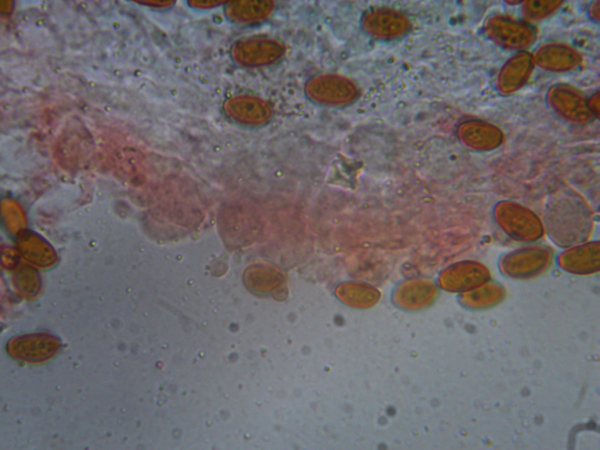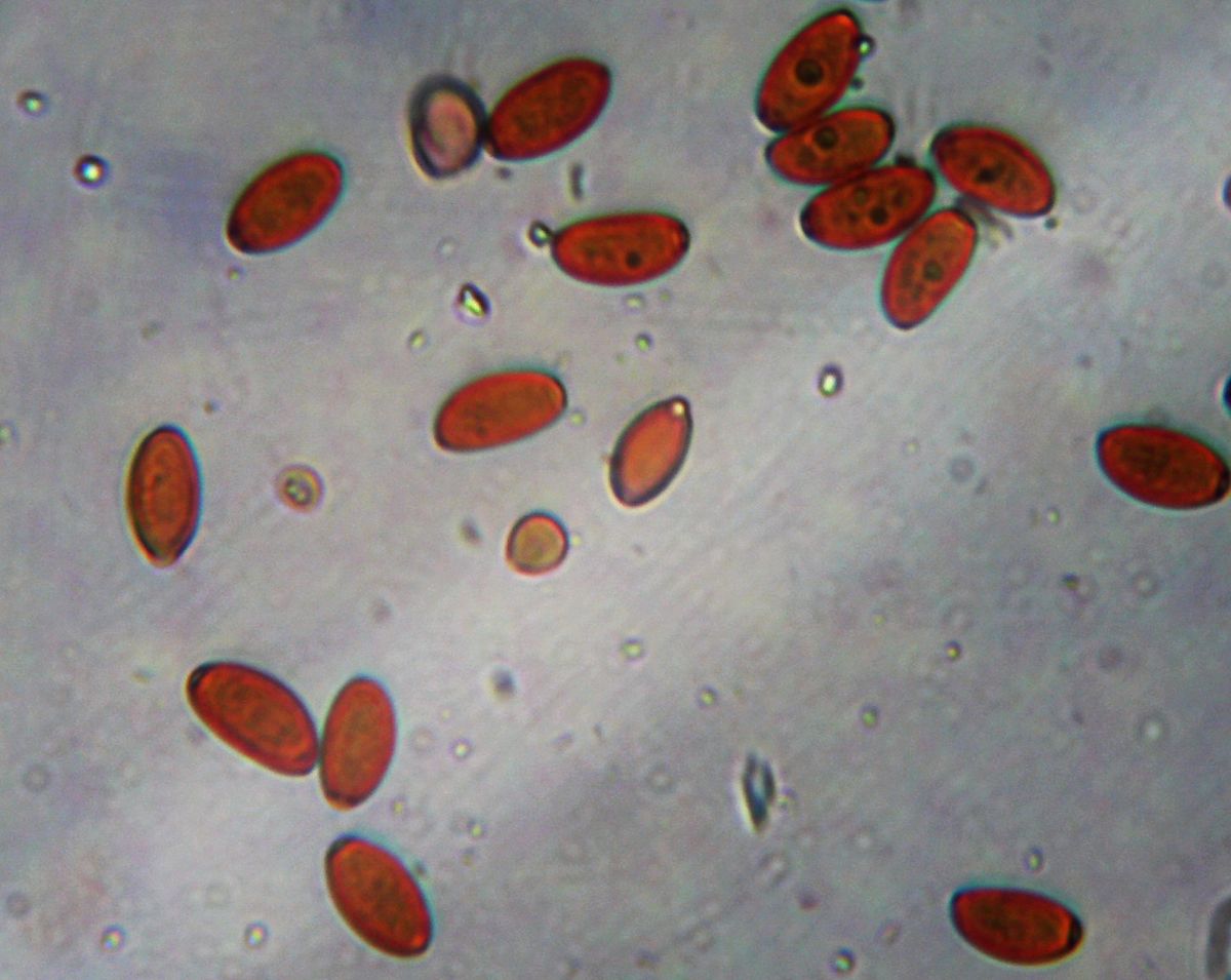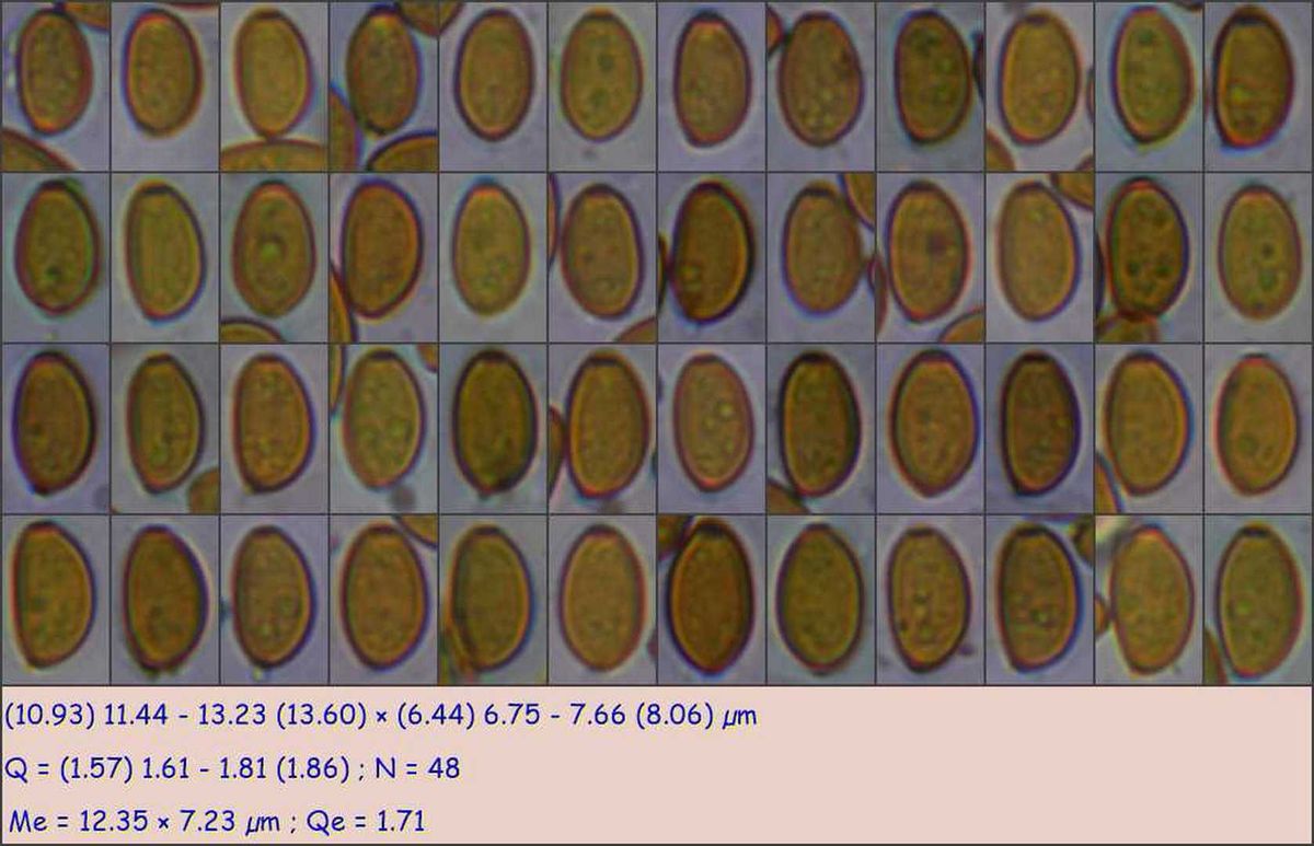 Споры: 11,0–13,5(–14,0) × 6,0–7,0 мкм (n = 20), Q = 1,57–2,03; L = 12,3±0,94 мкм, B = 6,8±0,39 мкм, Q = 1,80±0,14.