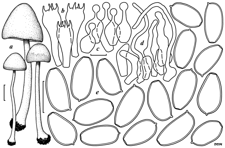 Conocybe apala: a – плодовое тело, b – базидии, c – хейлоцистидии, d – каулоцистидии, e – споры.