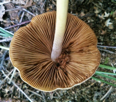 Пластинки: узко приросшие до почти свободных, частые (25–30 пластин доходят до ножки), с пластиночками. Шириной до 3,0 мм, сначала бледно-желтоватые, позже желто-коричневые до ржаво-коричневых, с одноцветным или немного более бледным мелковолокнистым краем.