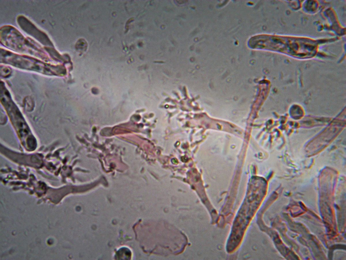 Гифы коркового слоя ножки шириной 2-3 мкм, гладкие или редко дивертикулированные, наросты 2-8 x 1-1,5 мкм, терминальные клетки увеличены до 5 мкм, различной формы, грубо дивертикулированные.
