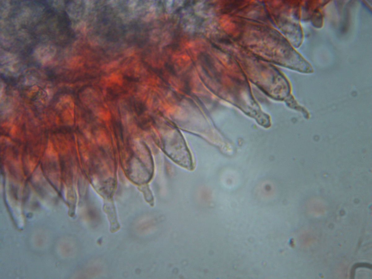 Хейлоцистидии 27-80 x 9-20 x 0-5,5 мкм, образующие стерильную полосу, лагеновидные, веретеновидные, субцилиндрические, реже булавовидные, суженные на верхушке в более длинную или короткую шейку, или рострированные до остроконечных, реже без шейки.