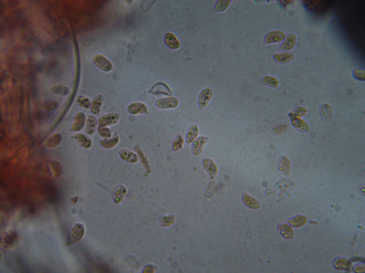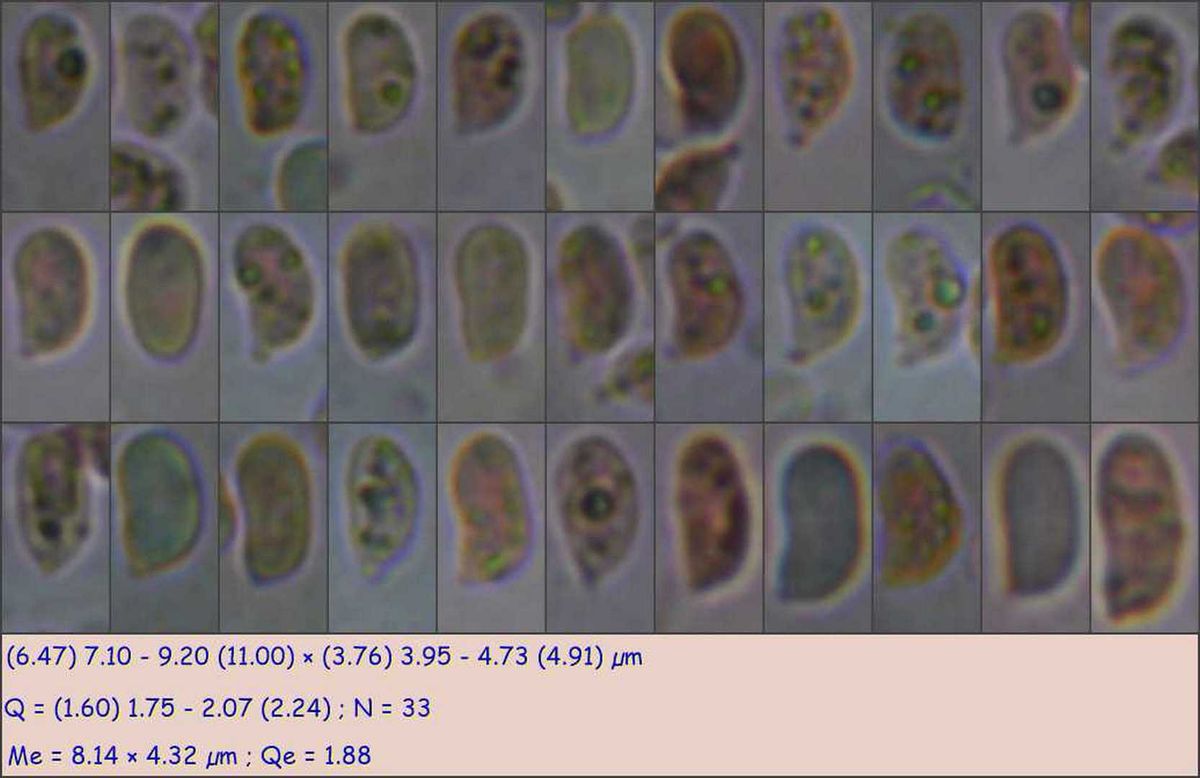Споры 7-9,6 x 3,6-5,8 мкм, Q 1,4-1,8, Q ср~1,7, от косточковидных до фазеолиформных, гладкие, амилоидные.