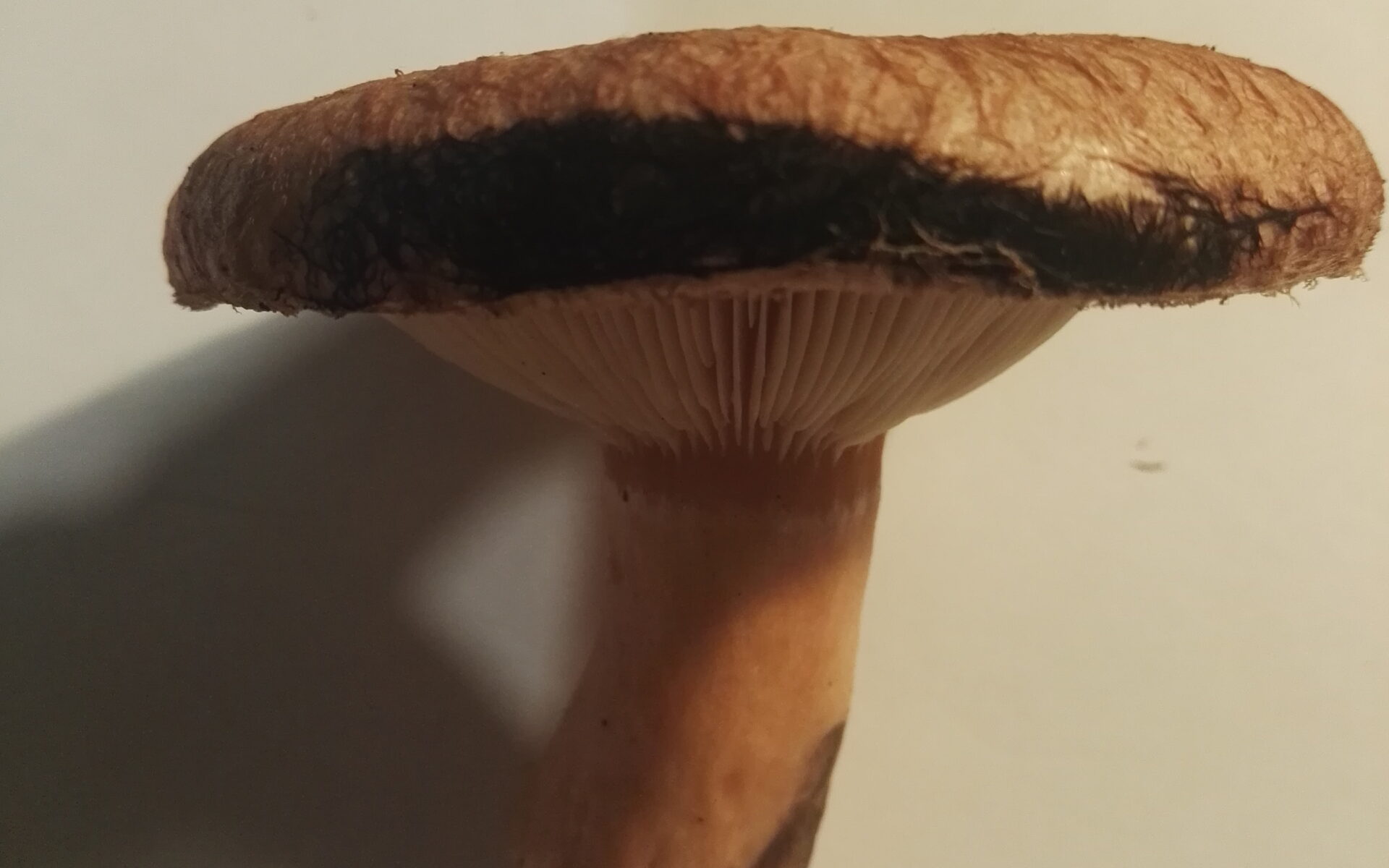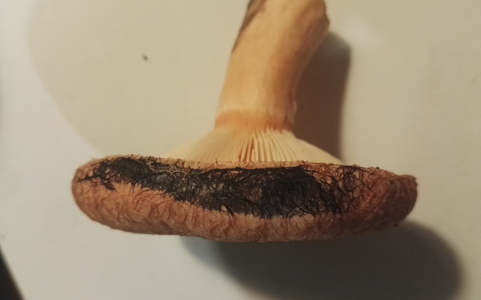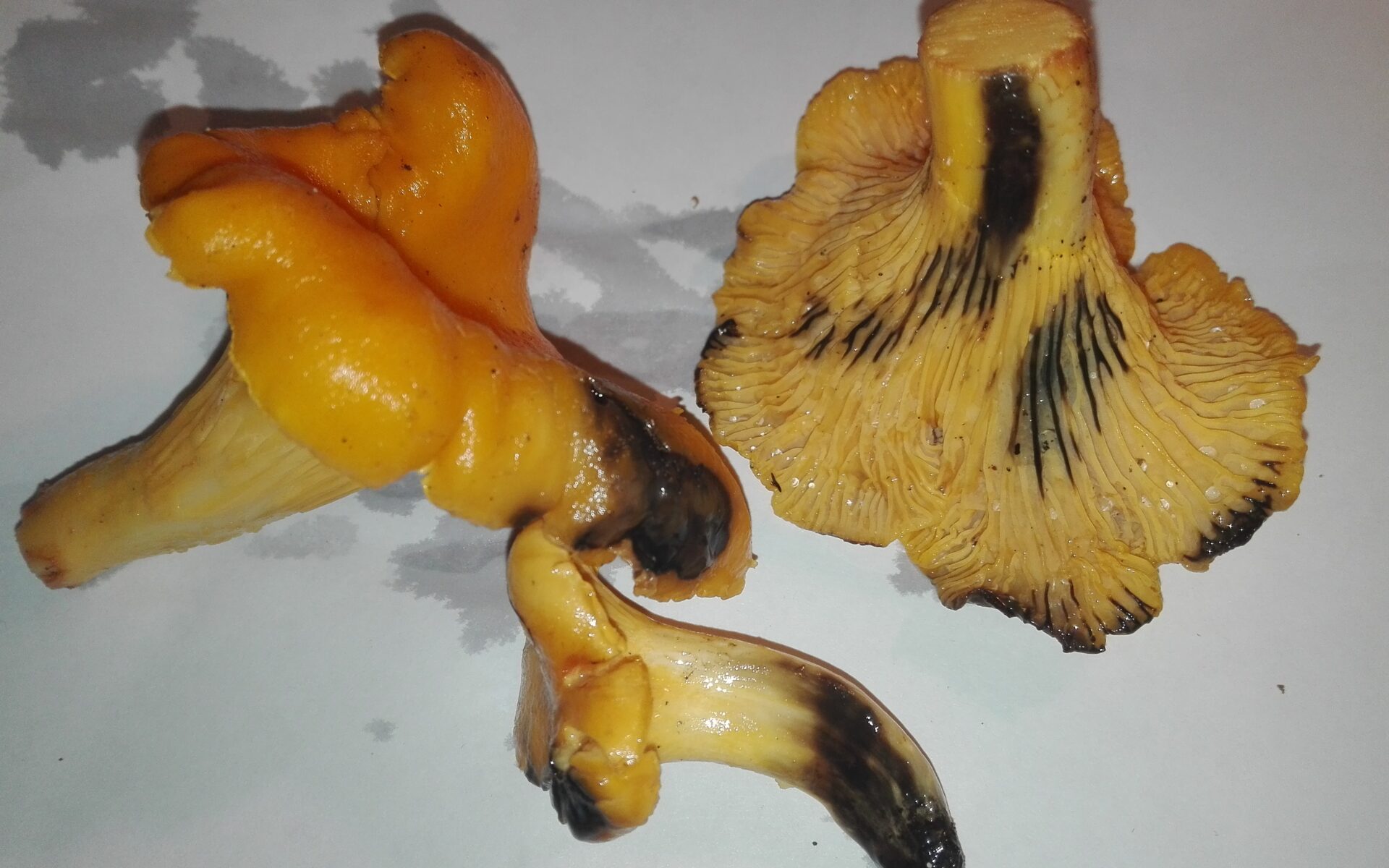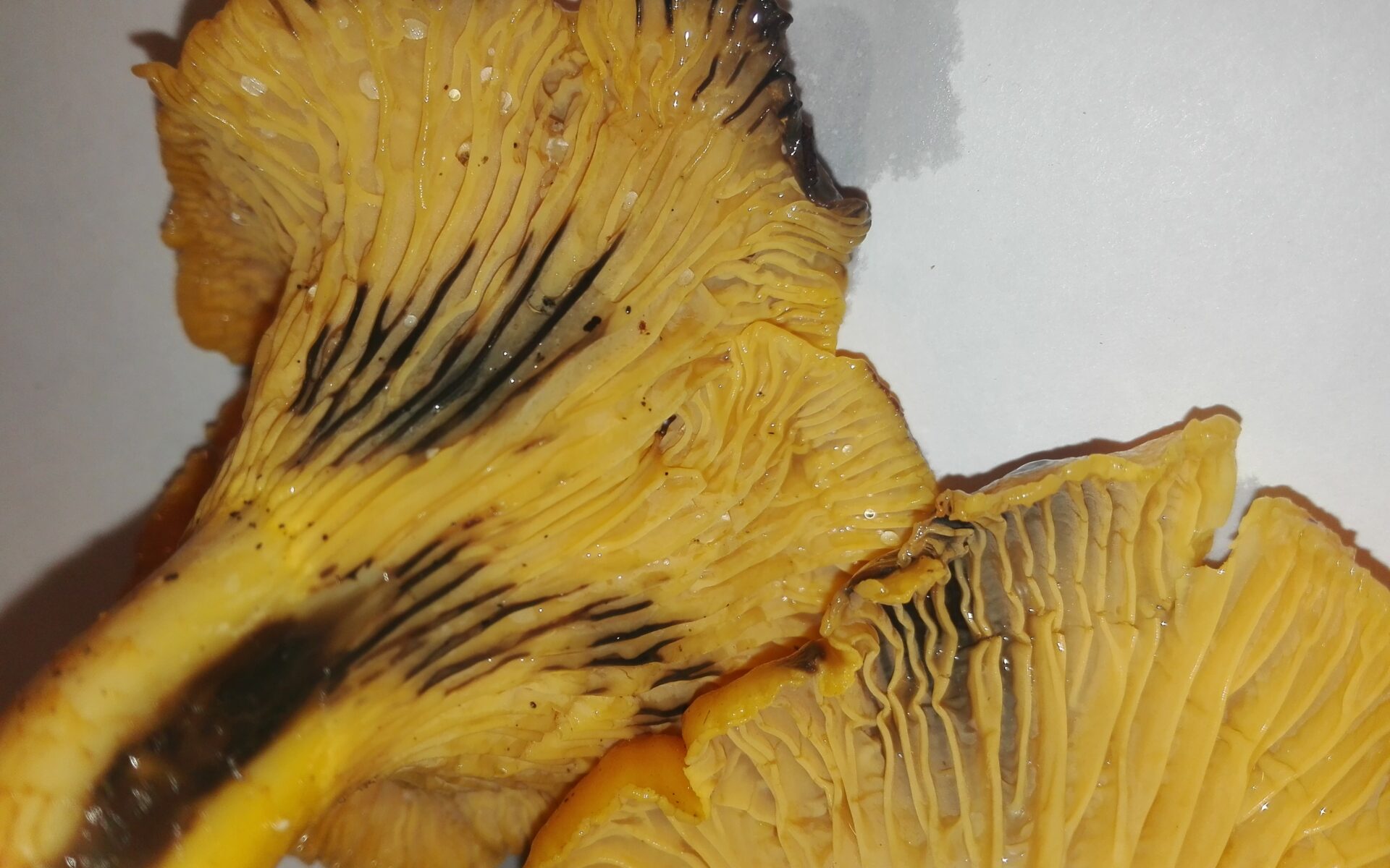 Если у волнушки чернь концентрируется в «ворсинках», то у лисички «поражение» уходит в глубину гриба. Если убрать поверхностный слой ножки лисички (смывается губкой) с черным участком, то под ним будет серый участок и пятно близкое к черному уходящее в тело гриба. На фото видно что чернь, при контакте на шляпке лисички, прошла насквозь и вышла к пластинкам гименофора.
