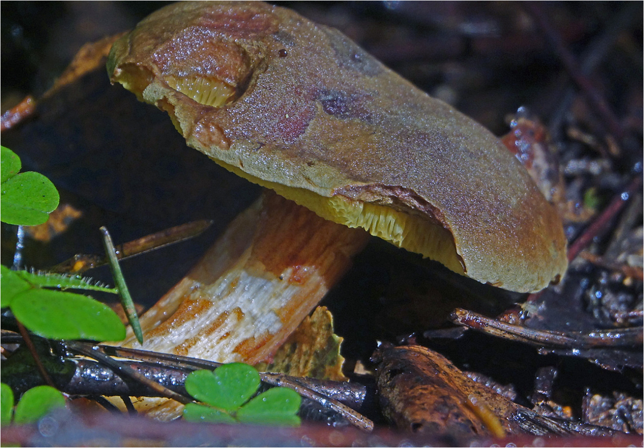Козляка (Suillus bovinus) у нас в Ленобласти столько много, что даже матом не описать. И среди этого иногда промелькивает зелёно-серо-бурым пятном зелёный моховик. И да, моховики растут поодиночке, а козляки — такими шоблами, аж страшно!
