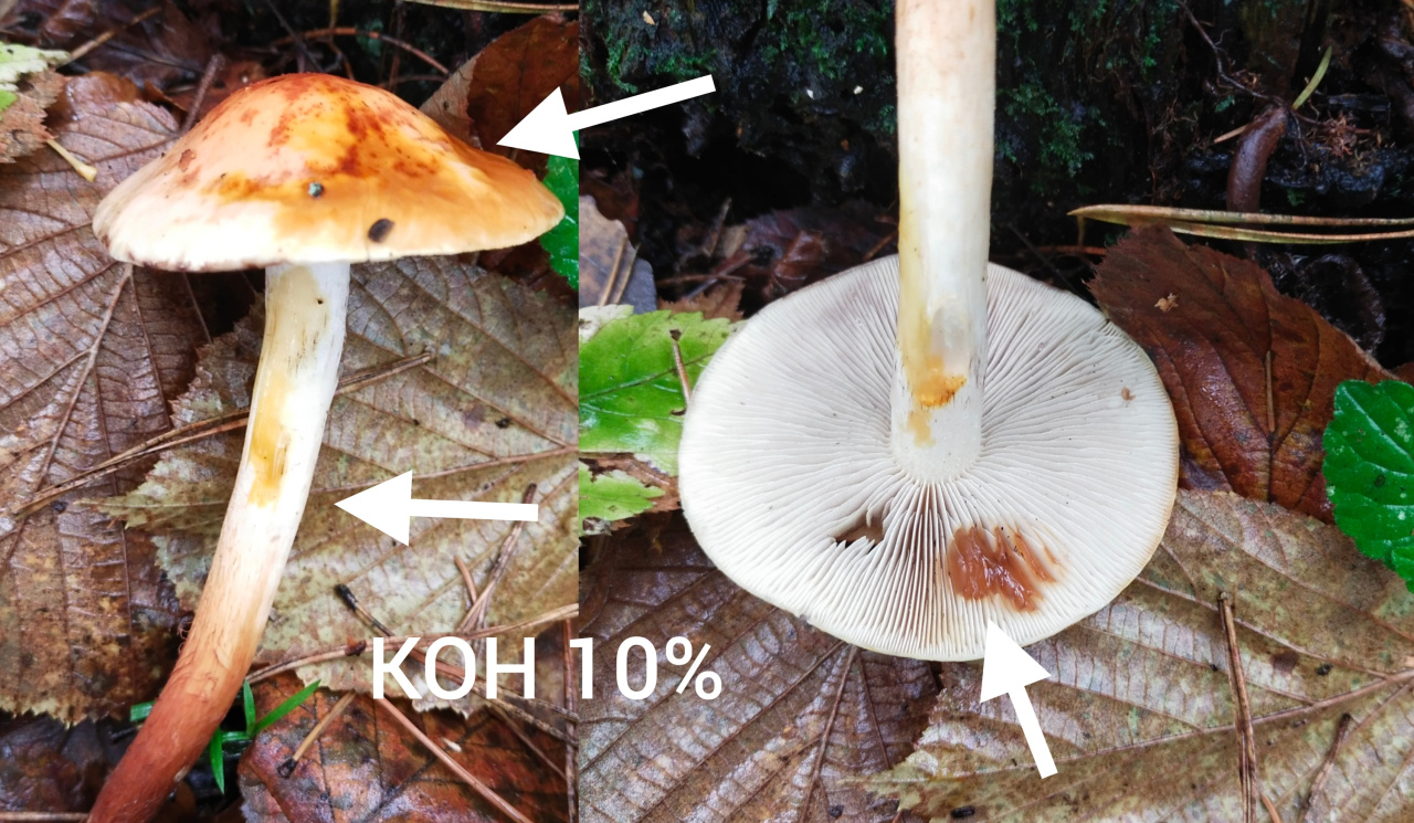 Химические реакции: KOH коричневатый на поверхности шляпки.