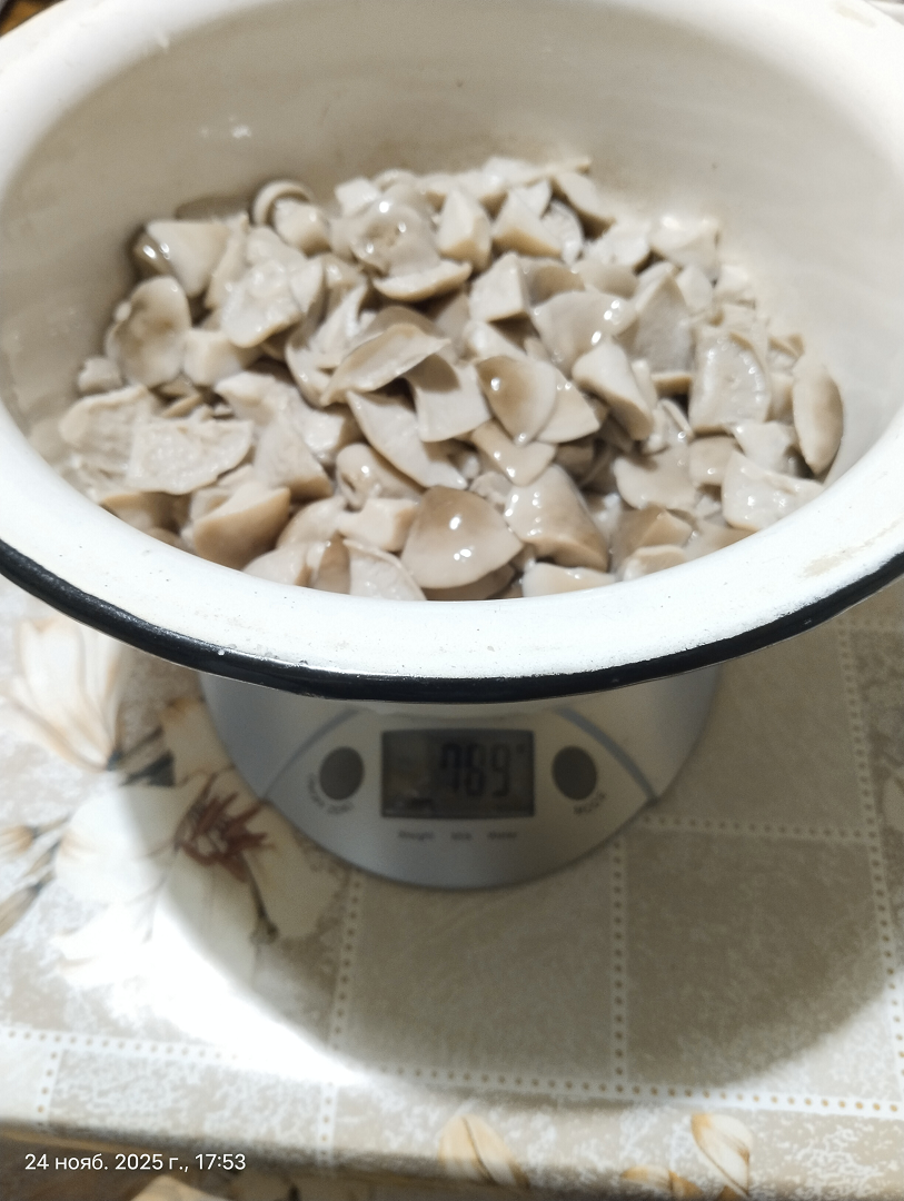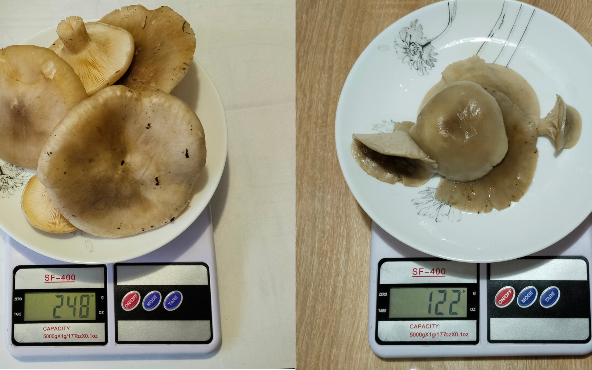 23 ноября в своём лесу, на окраине Москвы, я набрал много дымчатых говорушек. Это позволило проверить моё предположение. Надо сказать, что результаты проверки получились неожиданными. Я как обычно отварил порезанные дымки в течение 30 минут. В результате масса дымок уменьшилась с 1431 г до 789 г — лишь в 1,81 раза. То есть как будто измельчённые грибы увариваются меньше, чем целые (сравнивая с вашим экспериментом).