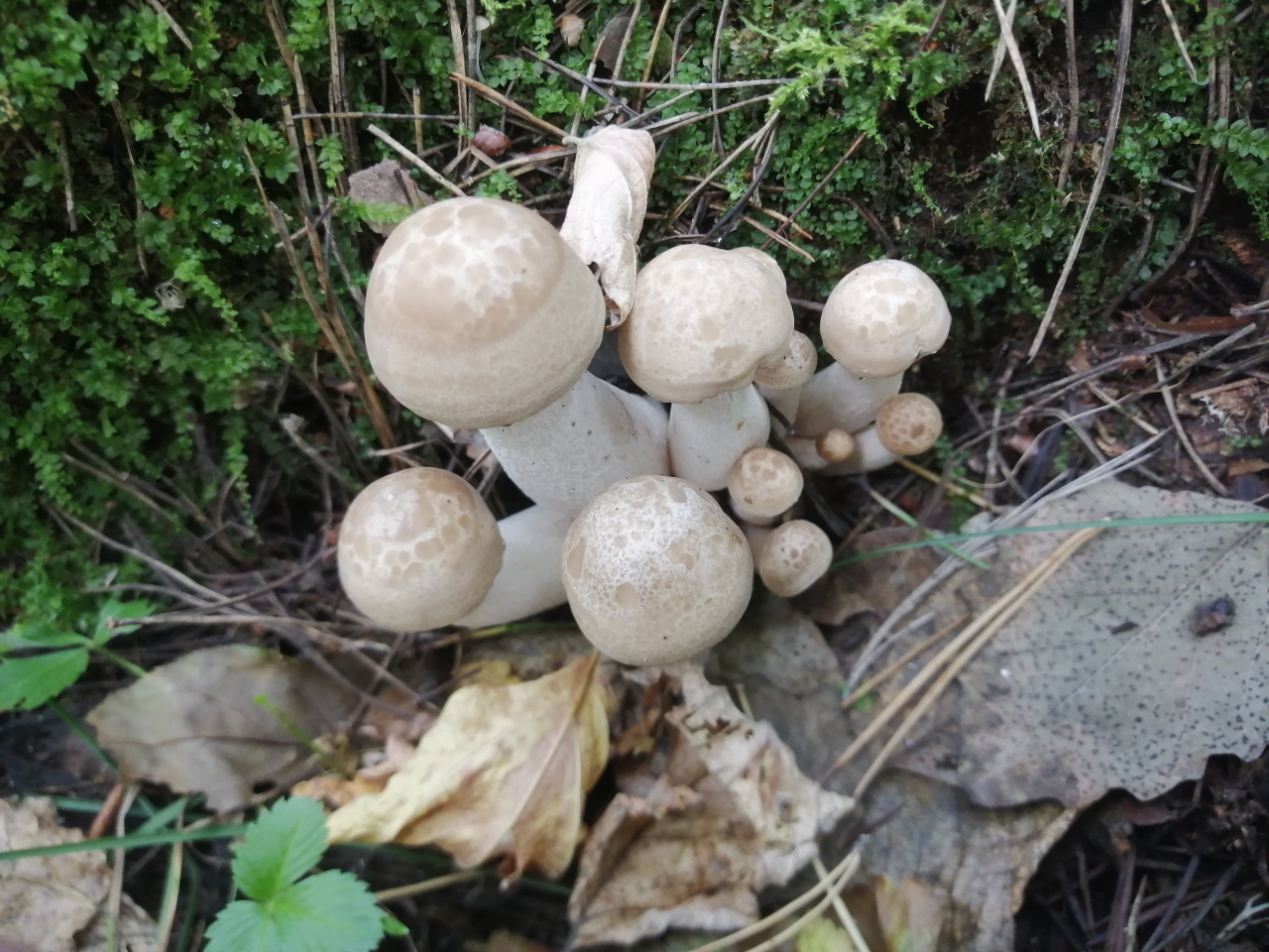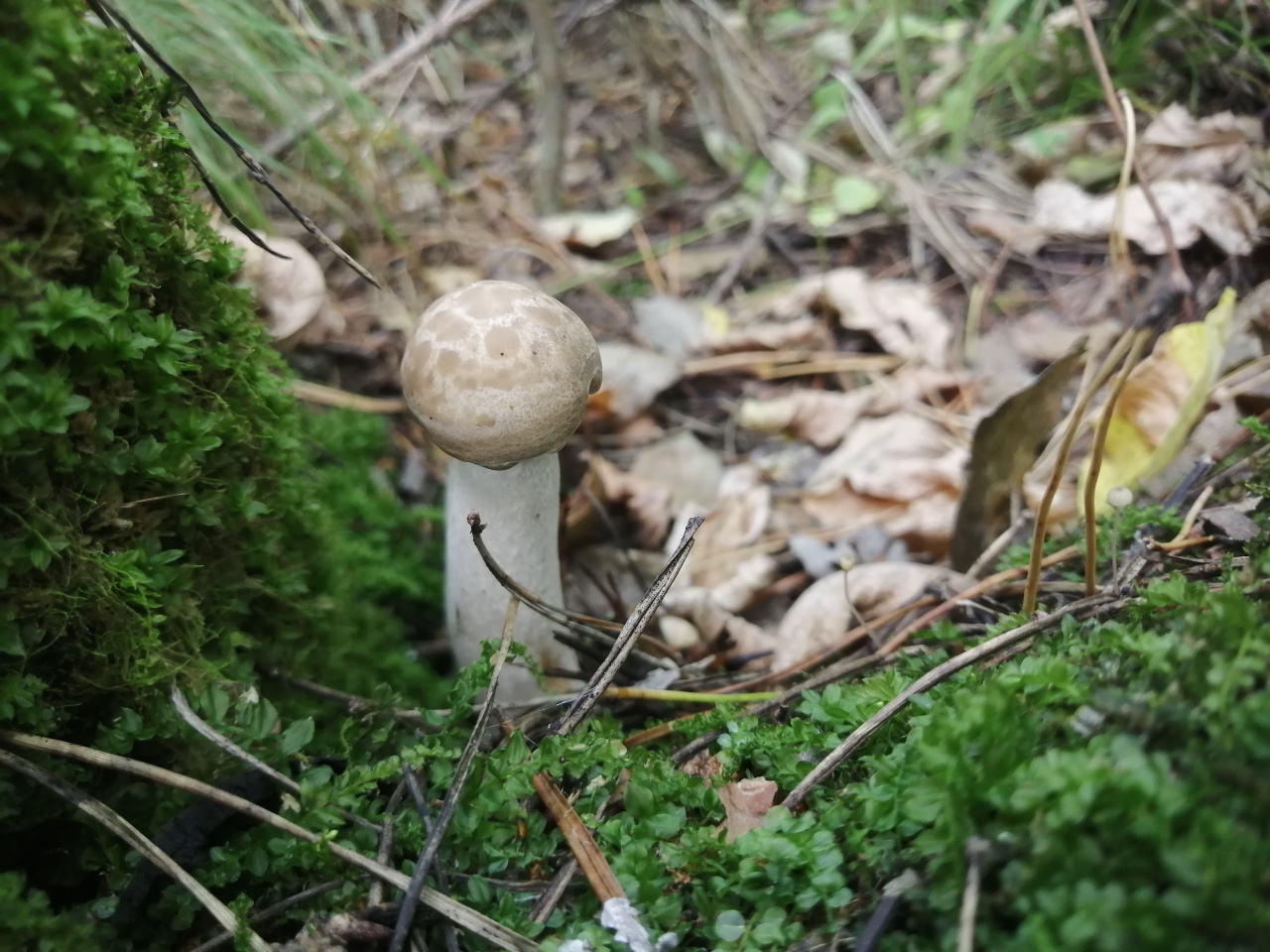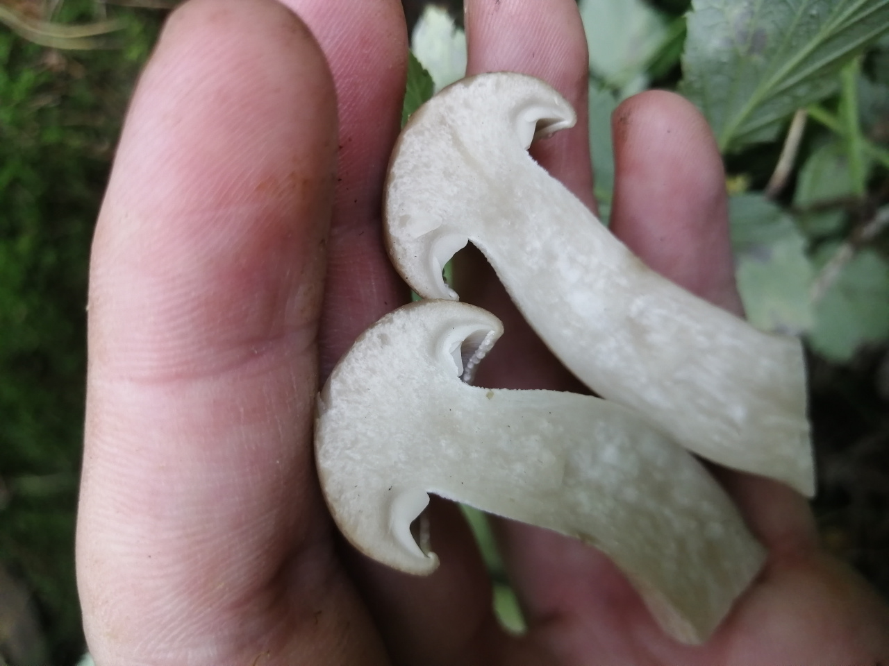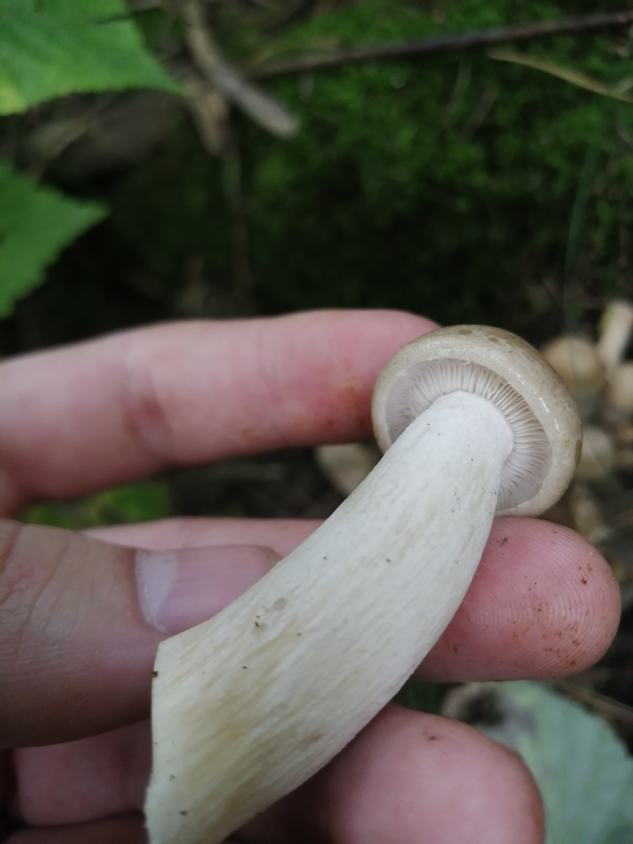 Описание гриба: «Семейка» грибов, шляпка серая, ножка белая. Рос в смешанном лесу, на березе. Мякоть белая, запах приятный, орехово-грибной.