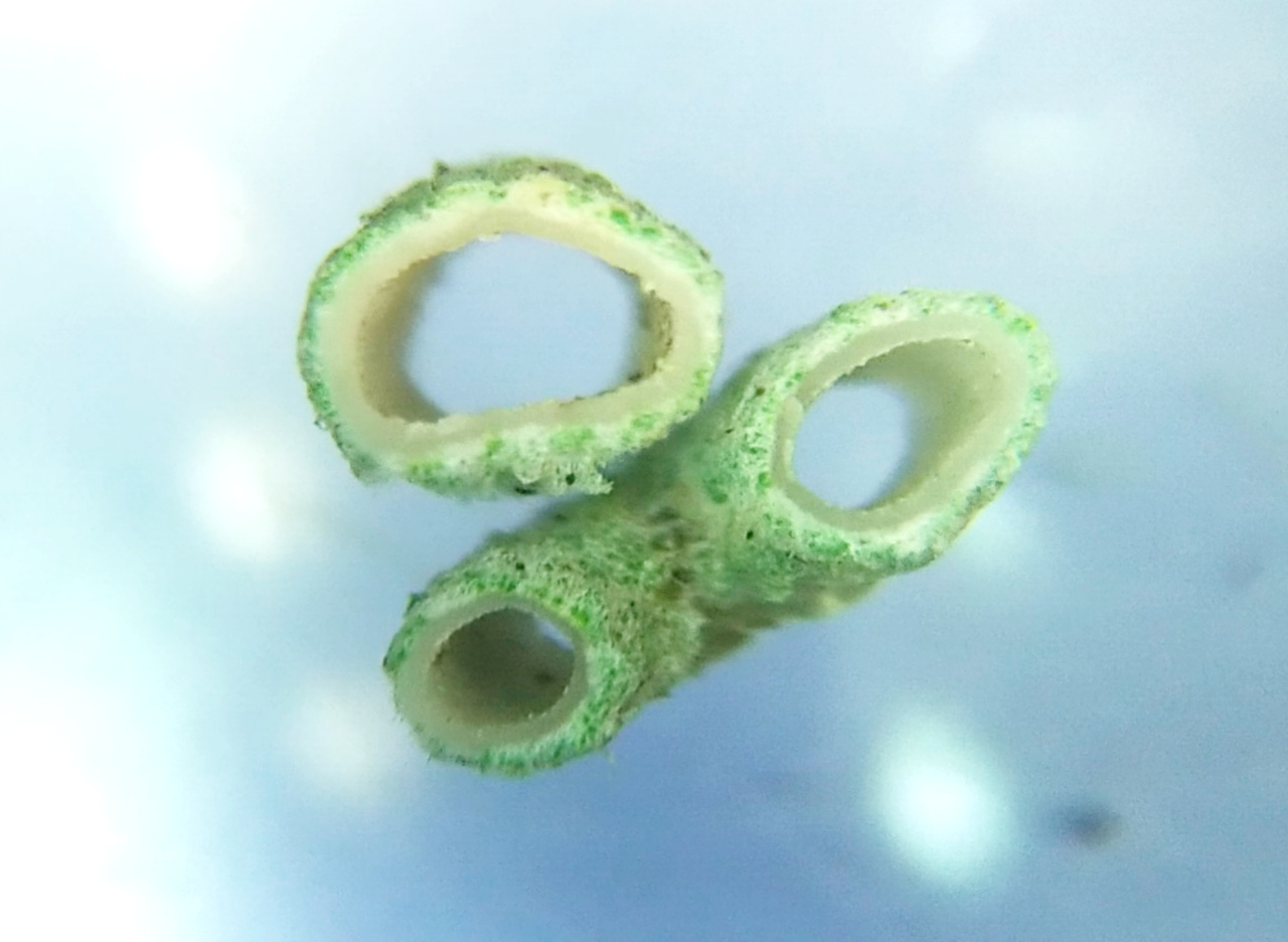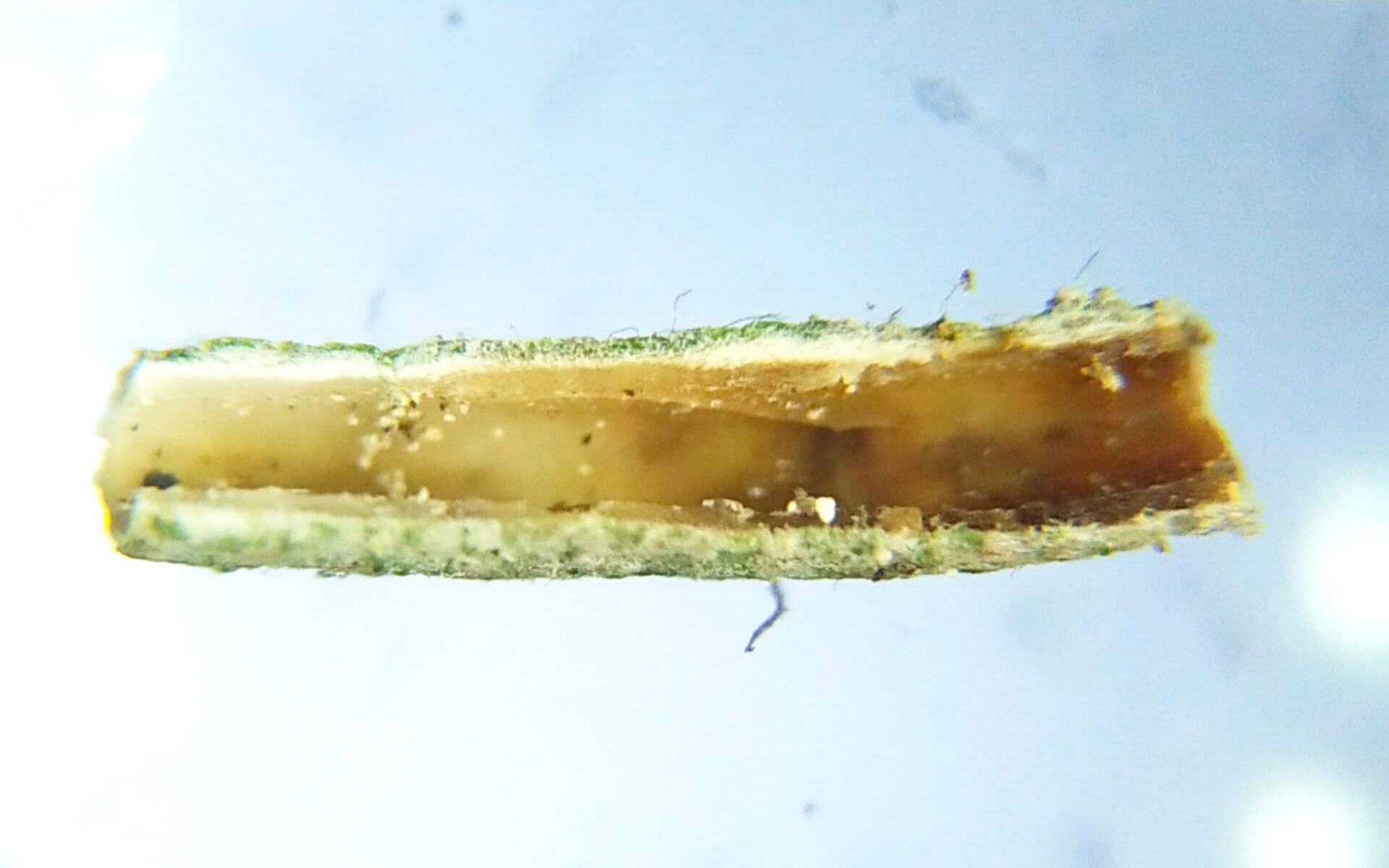 У кладоний сердцевина из рыхло переплетённых гиф, на губку похожа, как раз для хранения воды. Получается, если это нижняя часть ветки то могла окрашенную влагу из земли натянуть. Поэтому она с одной стороны и темнее.