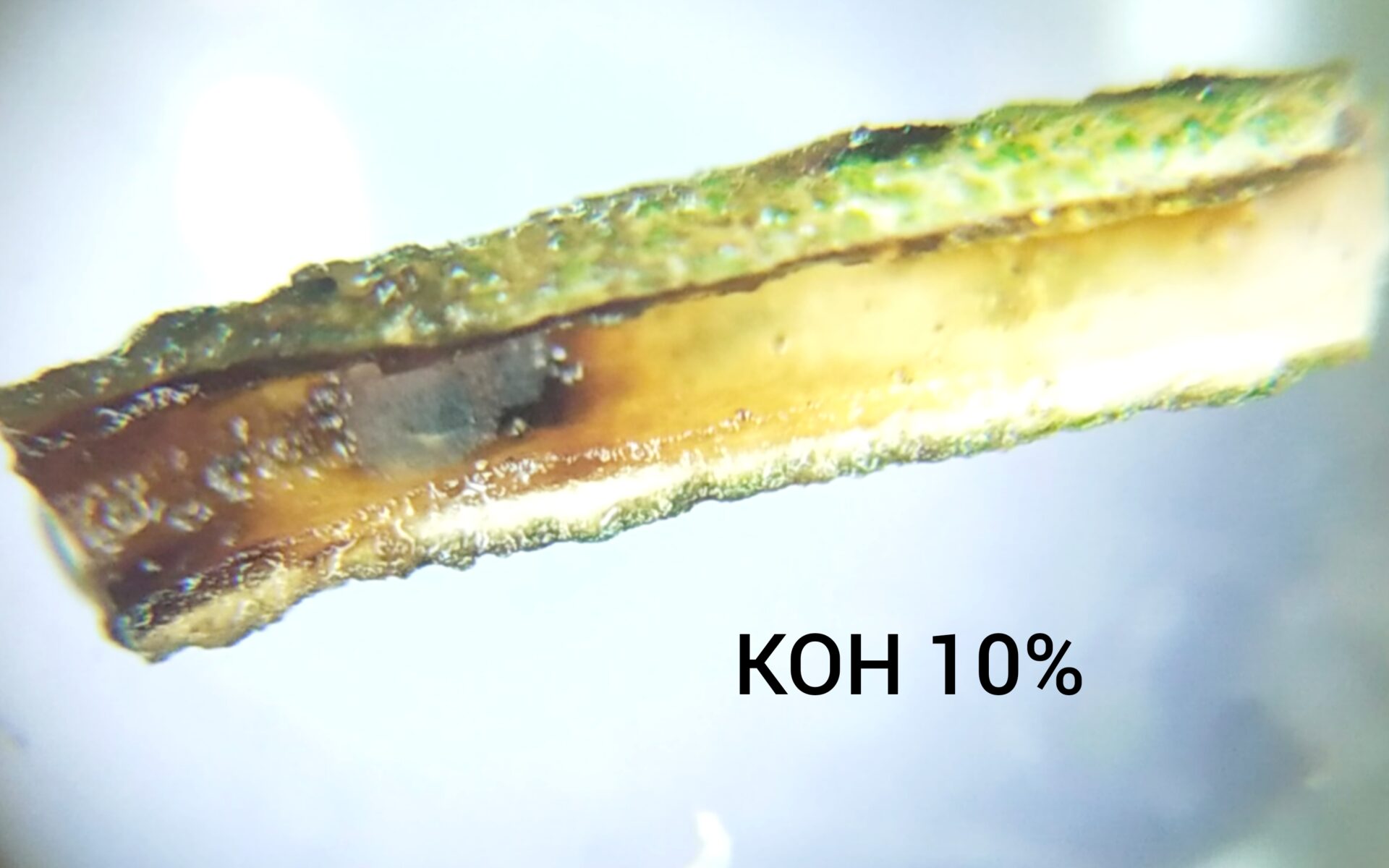 То есть, этот кусочек, видимо, и без КОН уже был коричневым, а с КОН почти не изменился. Может, испорченный какой, а может, я был небрежен и случайно повторно нанёс щёлочь на него или случайно испачкал…возможно, это мой косяк.