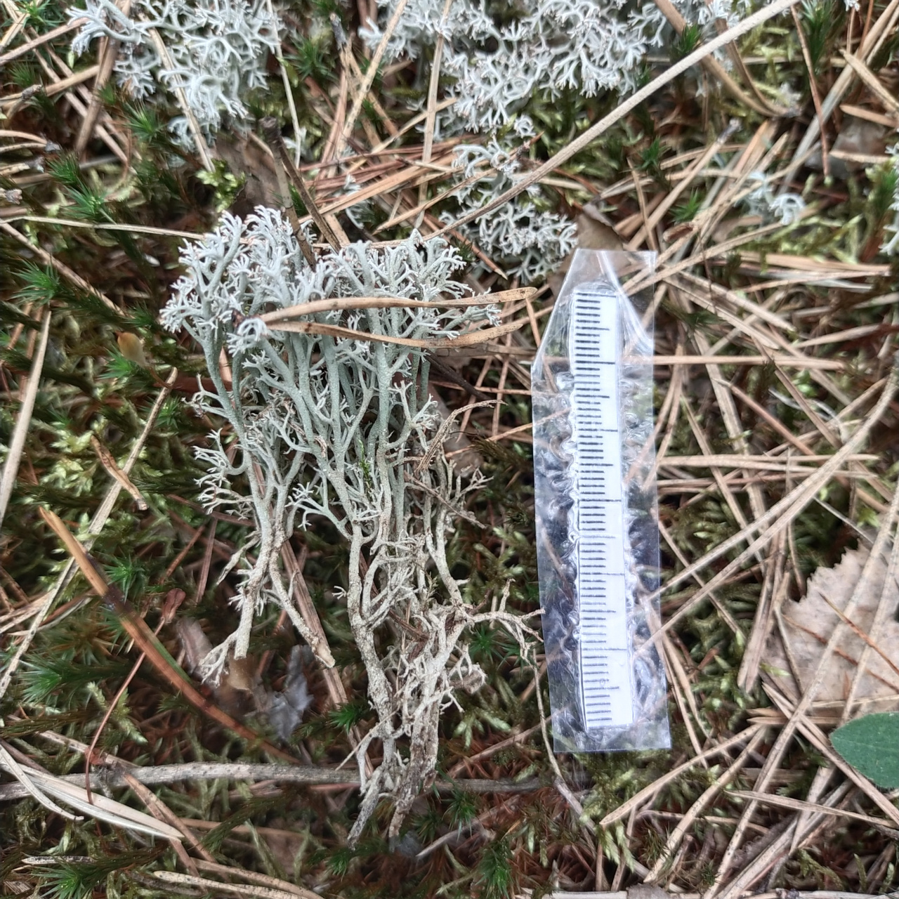 Куст не единый, а разбросан на отдельные веточки. С начала я думал, что куст ещё молодой, поэтому не плотный. Но после заметил, что та веточка которая с КОН изогнута. Похоже это следствие полегания уже высоких веточек (что характерно именно для Кладонии мягкой) и кустик уже начал расползаться.
