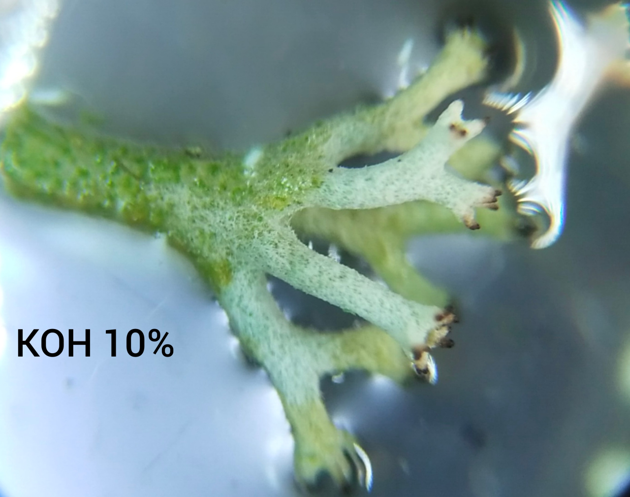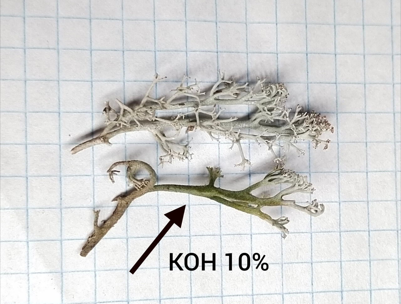 У Кладонии оленьей в сердцевине Рангиформиковая кислота. Она не даёт реакции с КОН.