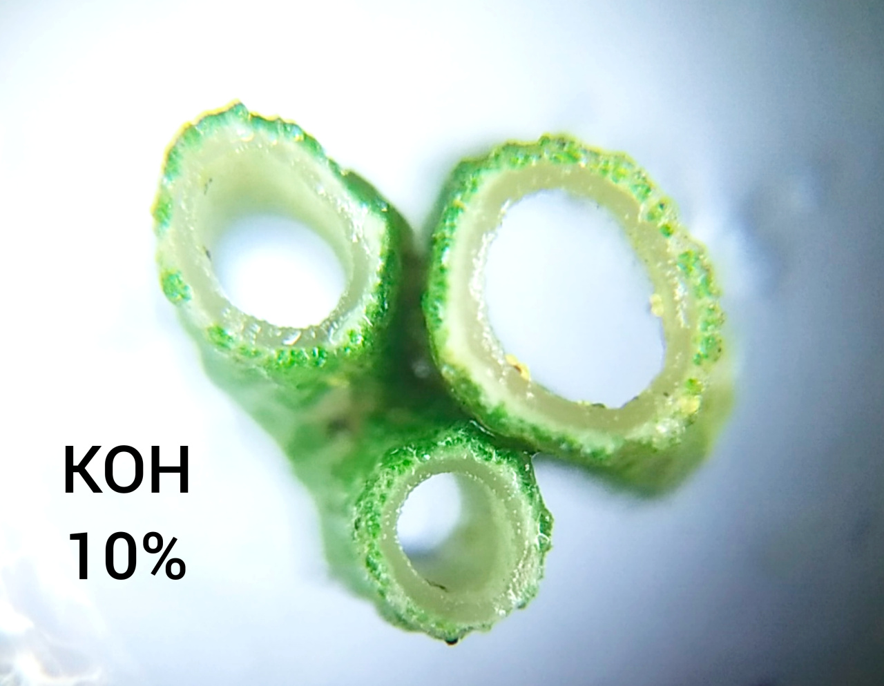 Как так получилось, что на поперечном срезе в сердцевине нет реакции на КОН, а в продольном она коричневая?