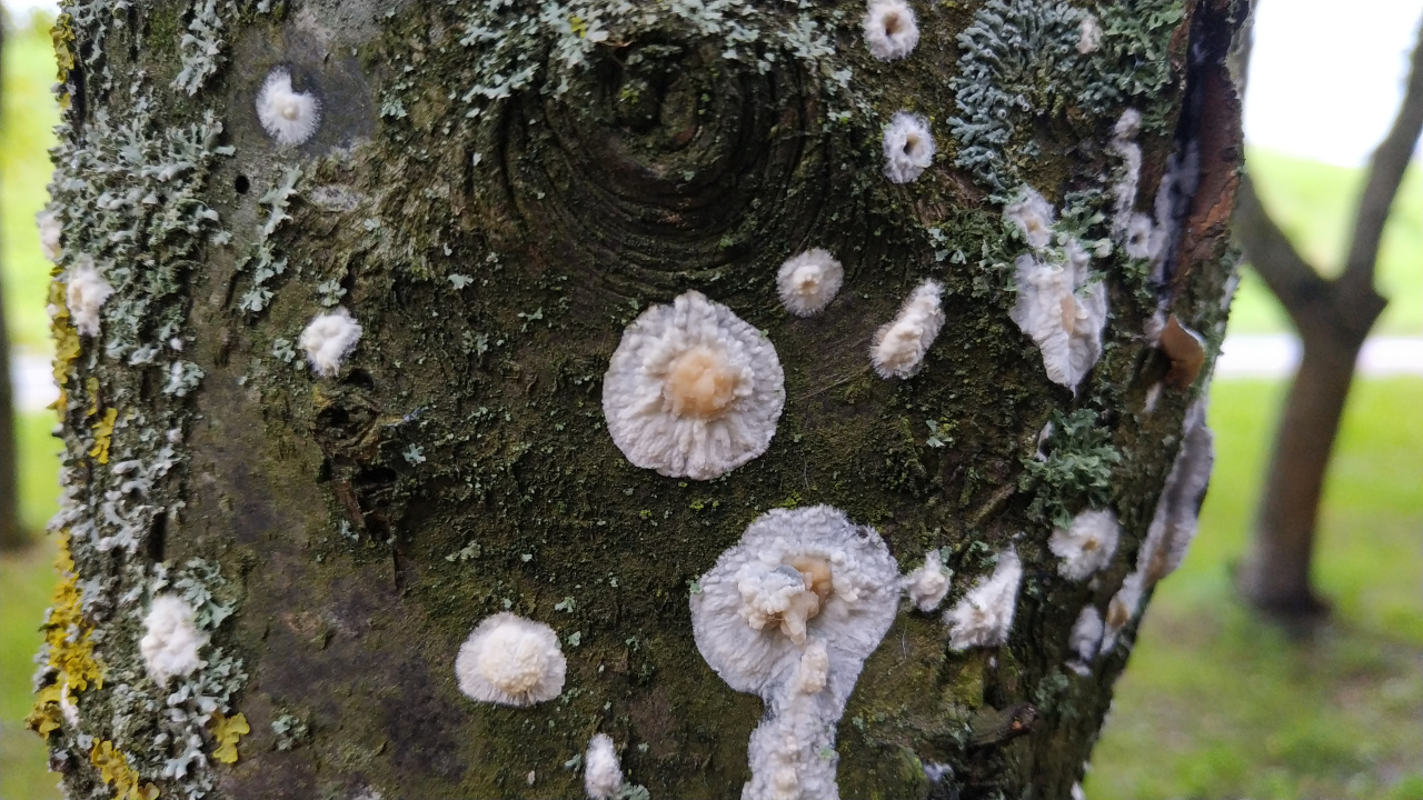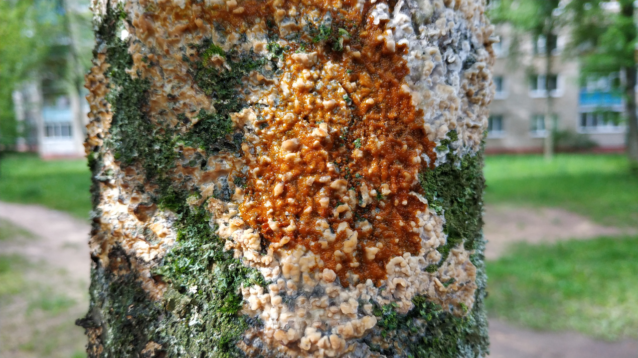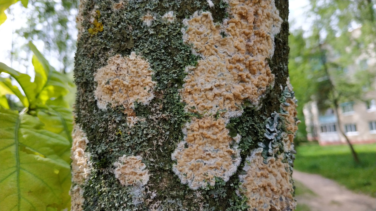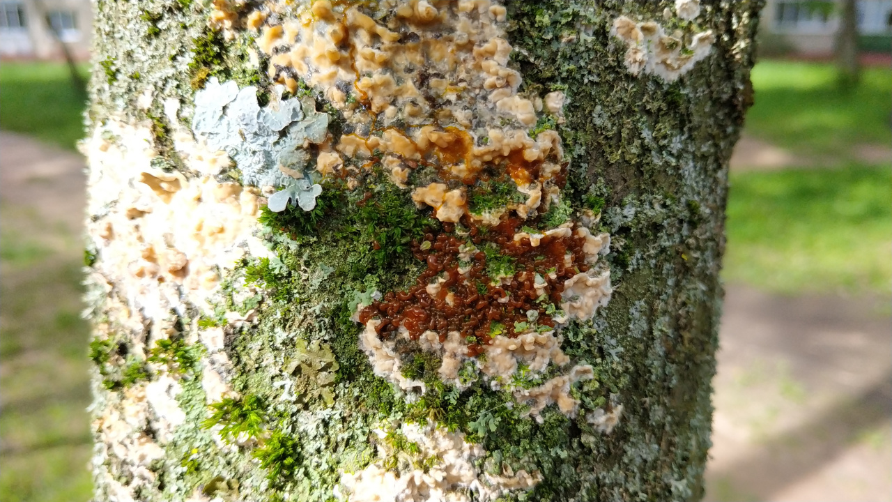 Описание гриба: Грибы росли на молодых мёртвых лиственных деревьях. Скорее всего рябина. Появились после долгих длждей. Начинаются как округлые пуговицы, потом разрастаются до пятен. С возрастом становятся красно-коричневыми. На ощупь как резина. От них исходит довольно сильный приятный грибной запах.