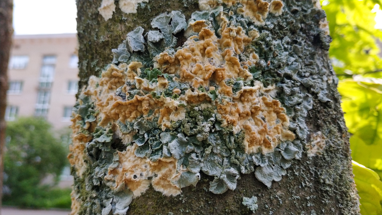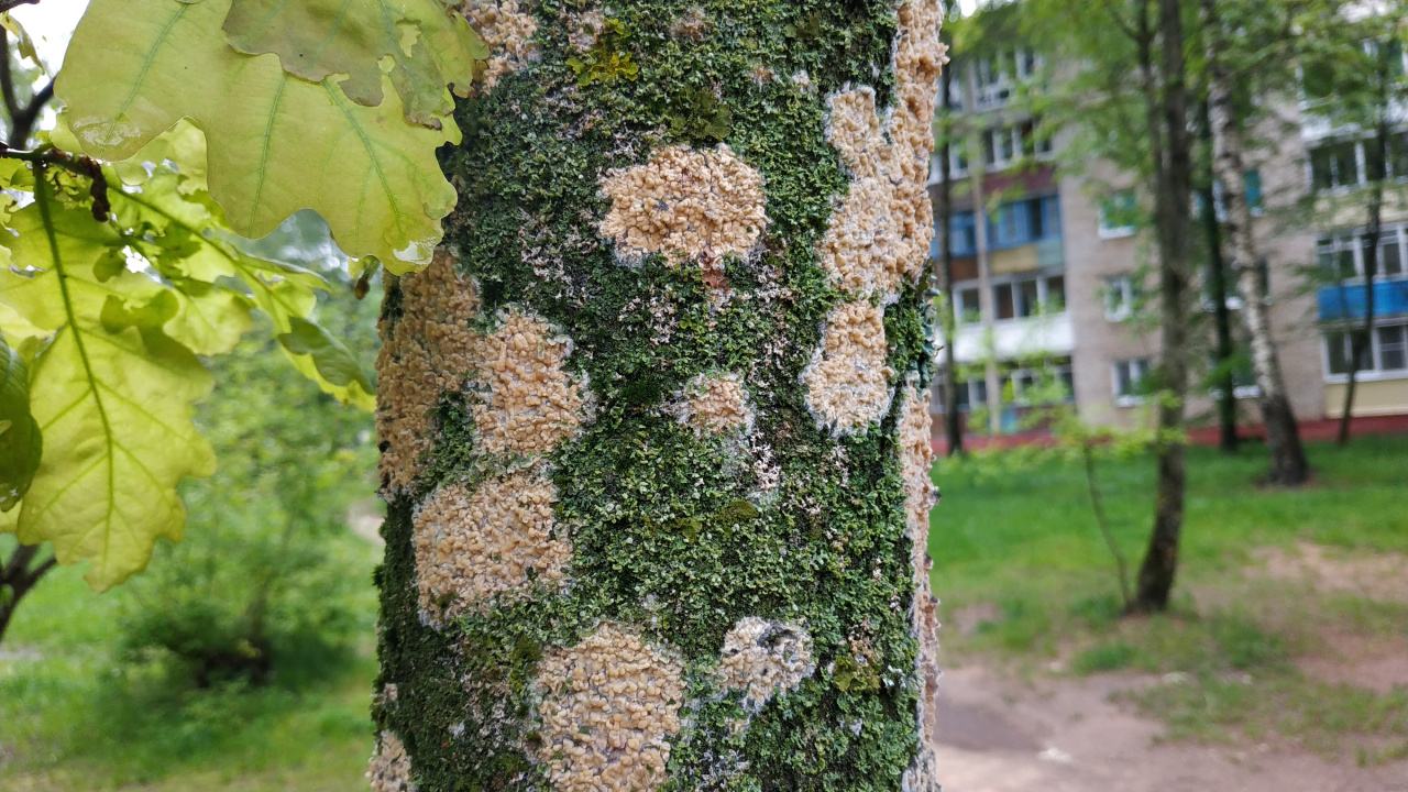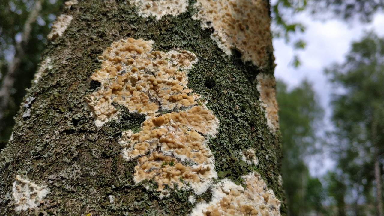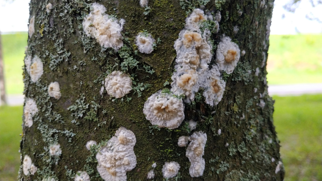 Описание гриба: Грибы росли на молодых мёртвых лиственных деревьях. Скорее всего рябина. Появились после долгих длждей. Начинаются как округлые пуговицы, потом разрастаются до пятен. С возрастом становятся красно-коричневыми. На ощупь как резина. От них исходит довольно сильный приятный грибной запах.