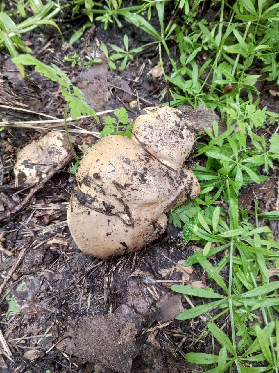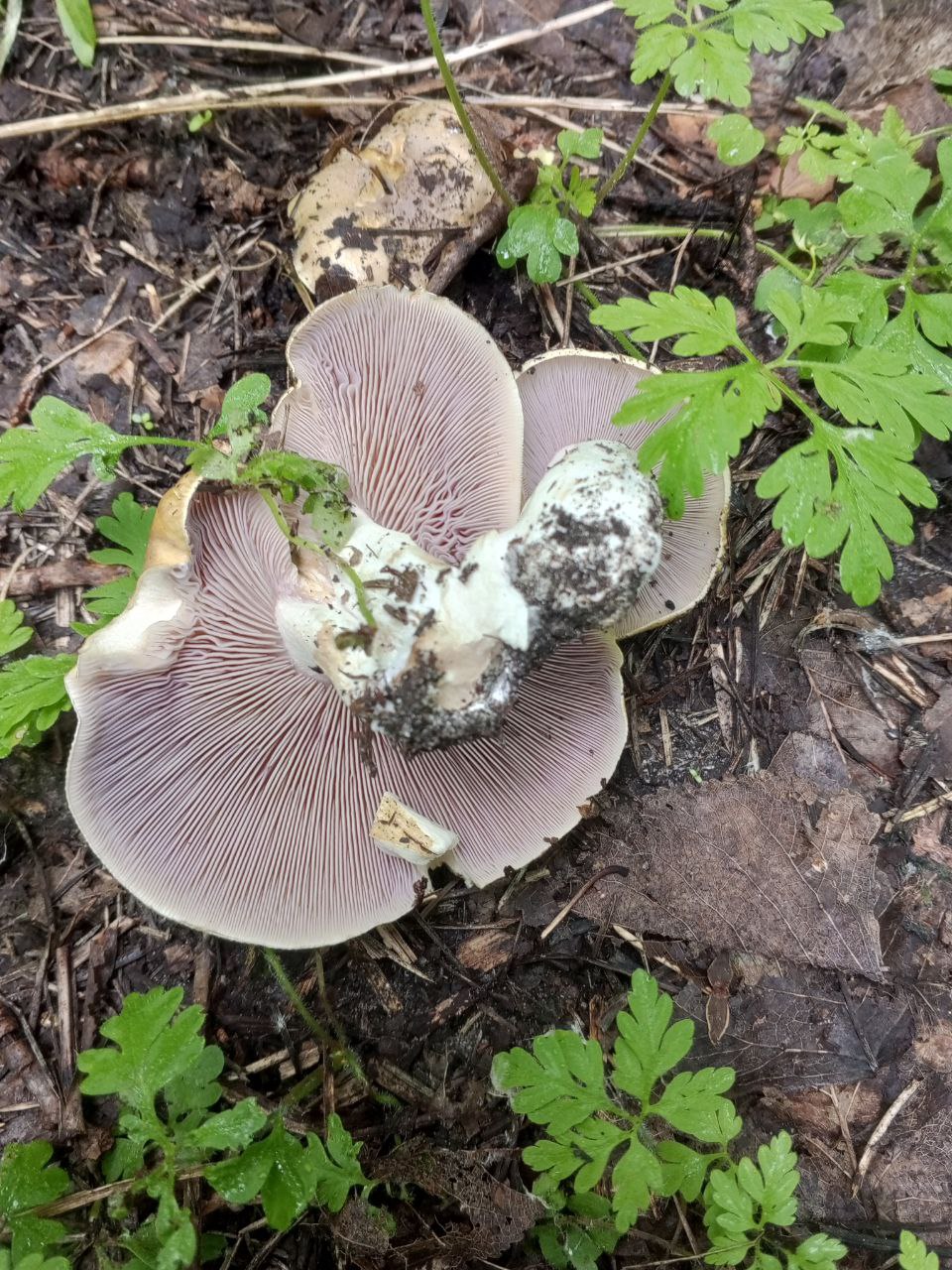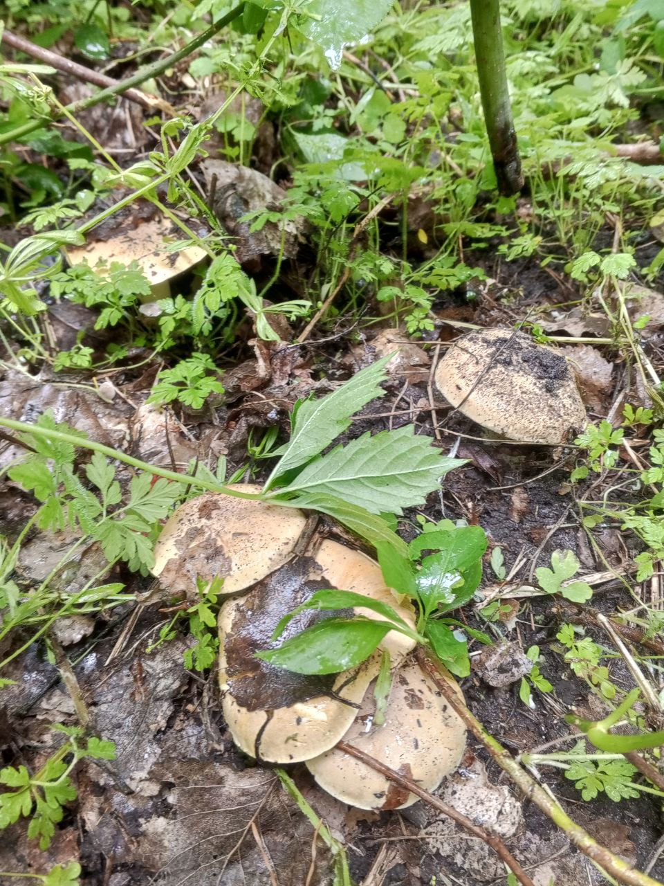 Описание гриба: Начало июня. Лиственный лес. Грибы растут кучно, оливковая шляпка, серо-фиолетовые пластины. Запах приятный грибной.