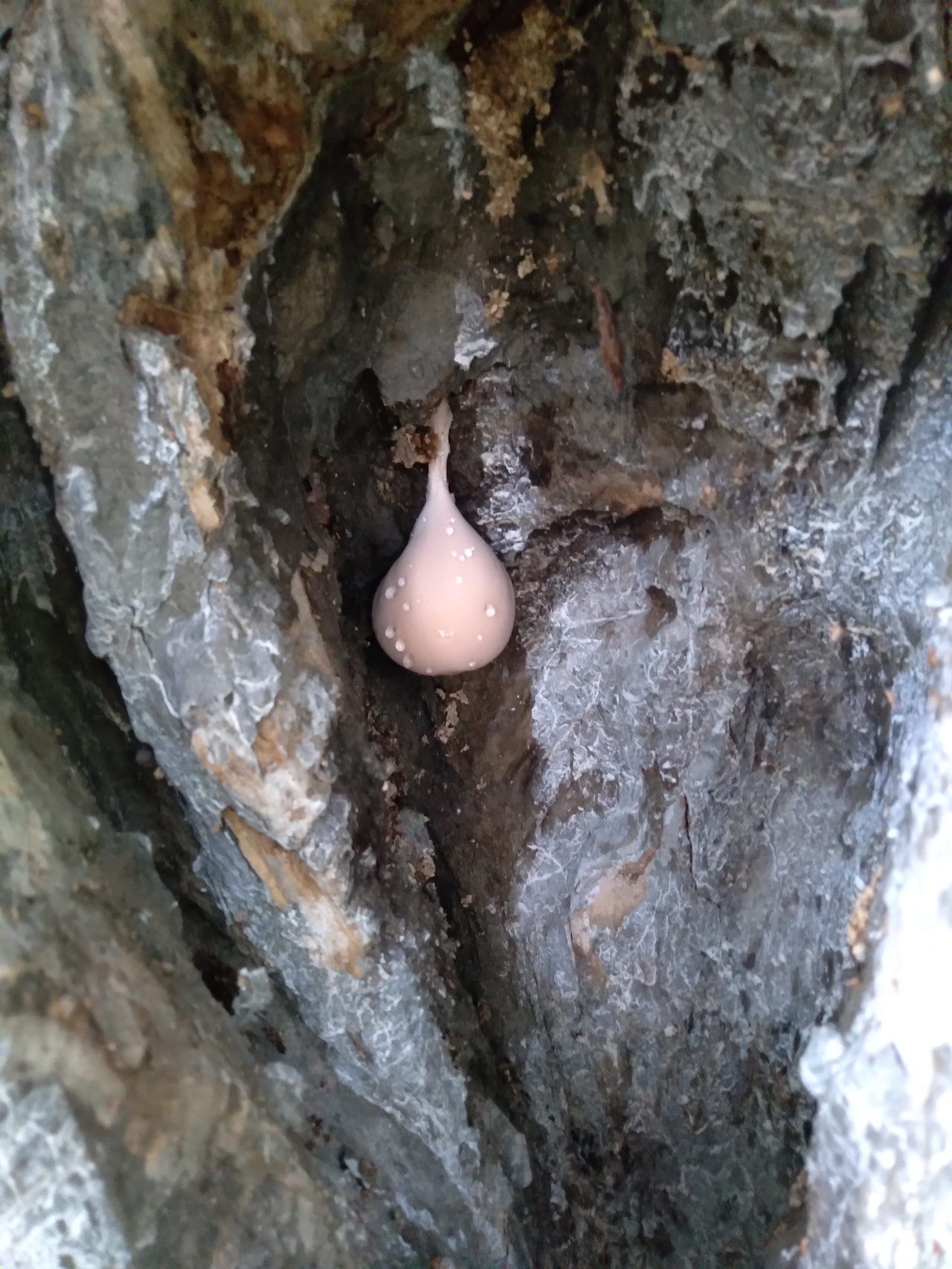Описание гриба: 04.06.2025г. Каплевидной формы, прикреплён жгутиком в дупле грецкого ореха. Розоватого цвета, на ощупь мягкий, в разрезе как тёмно- серый пластилин.