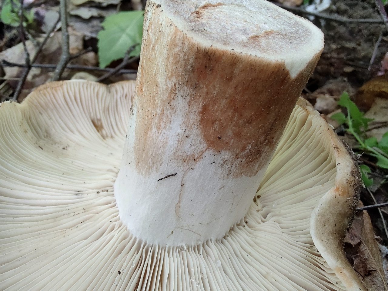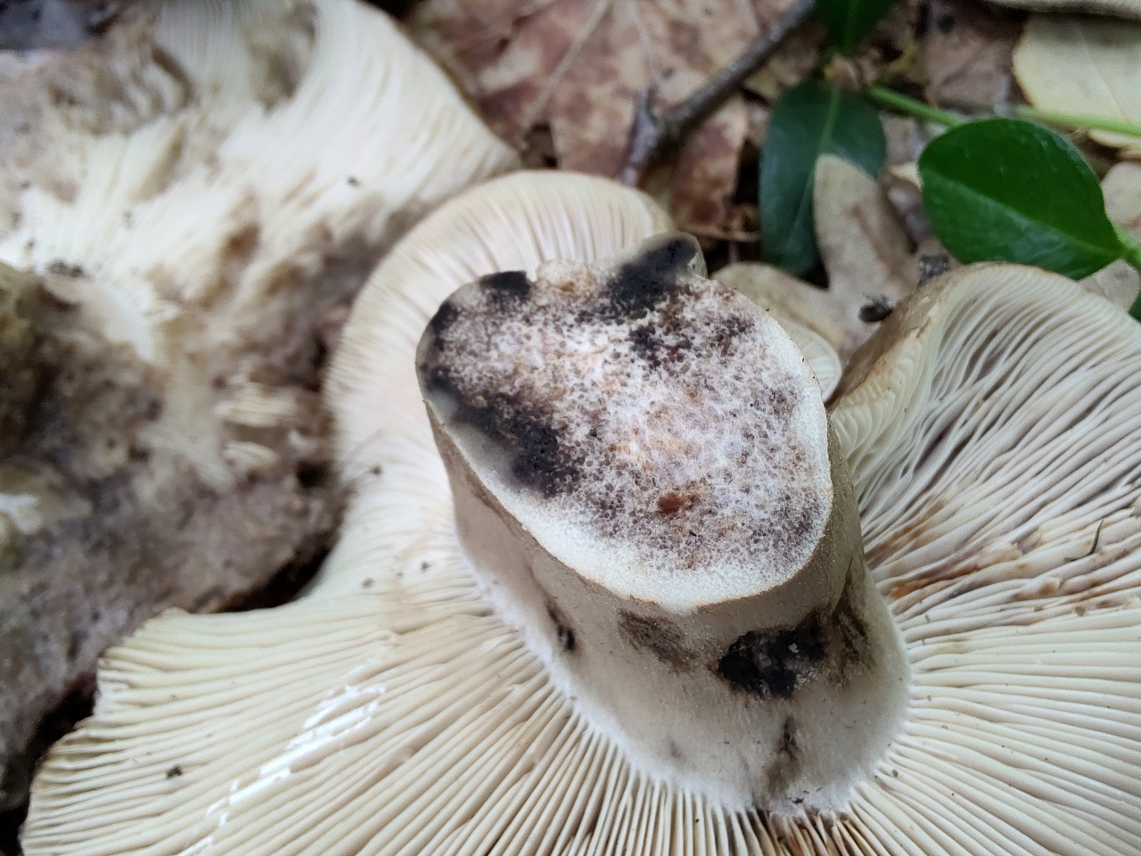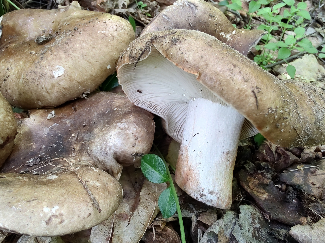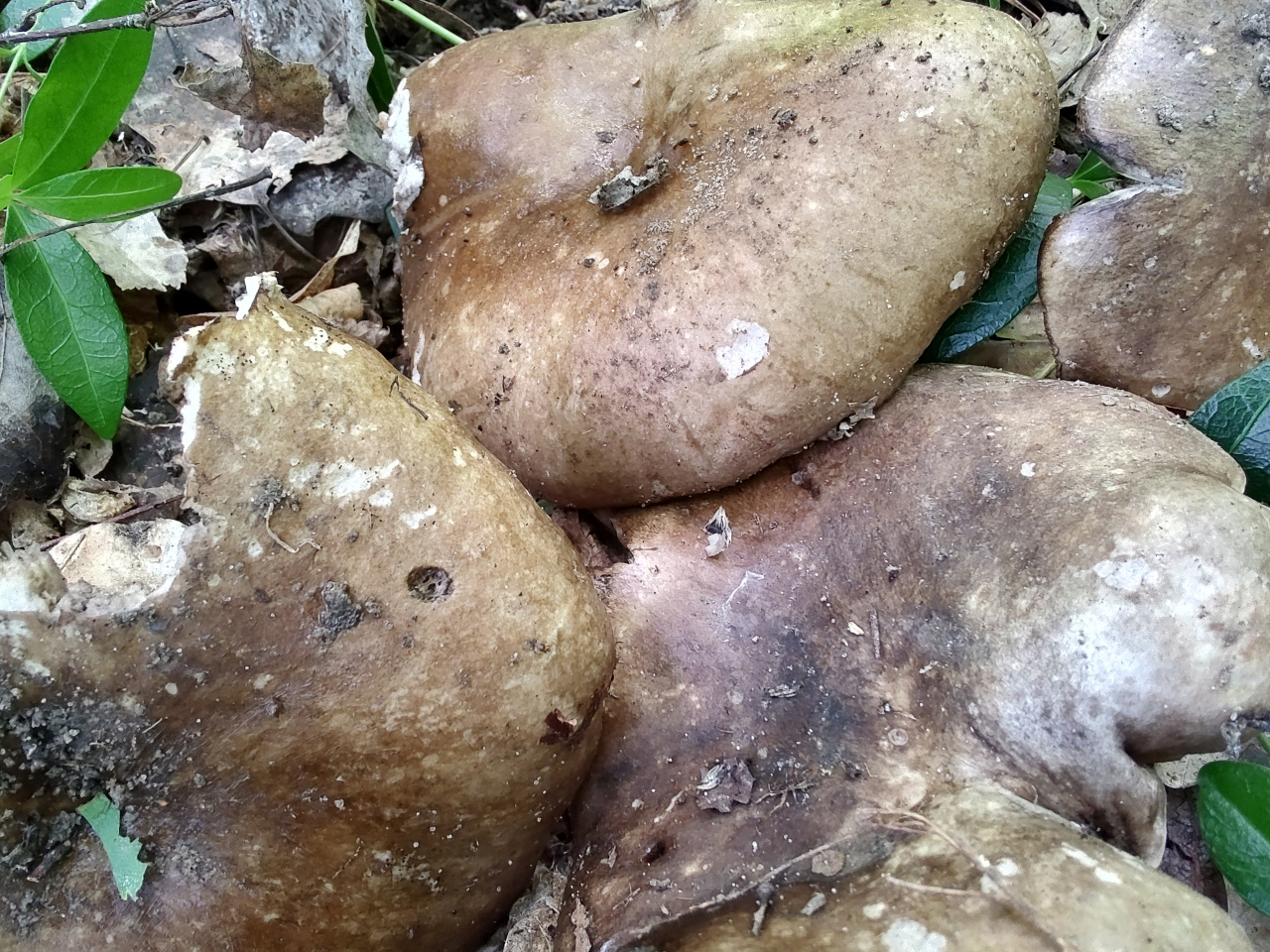 Описание гриба: Гриб растёт в лиственном лесу. Гриб плотный, крупный, растёт группами и сростками по несколько штук. Запах не могу определить, На срезе ножка имеет затемнённости. В местах надавливания ножка постепенно меняет цвет на красноватый. 15.06.2025