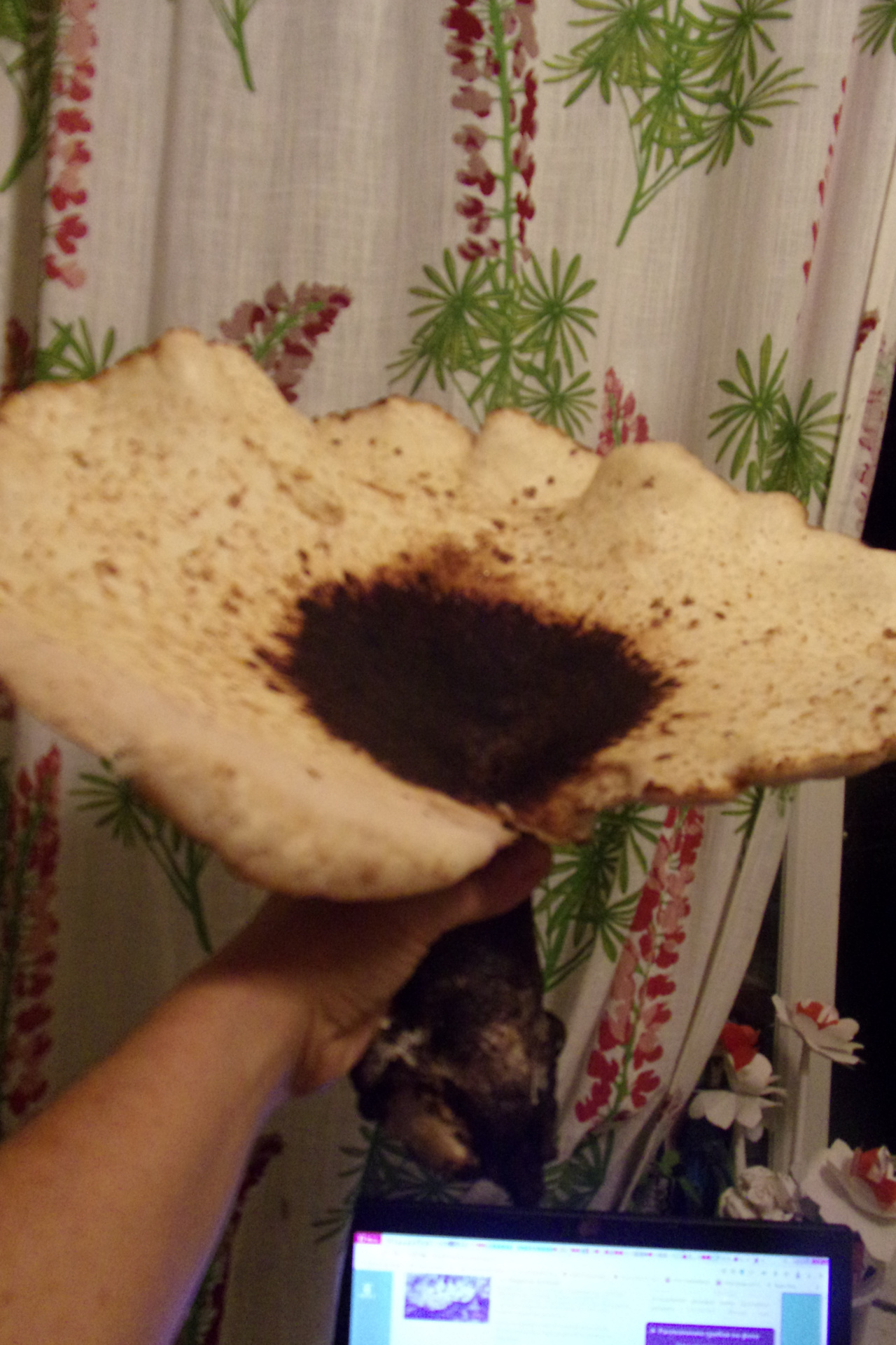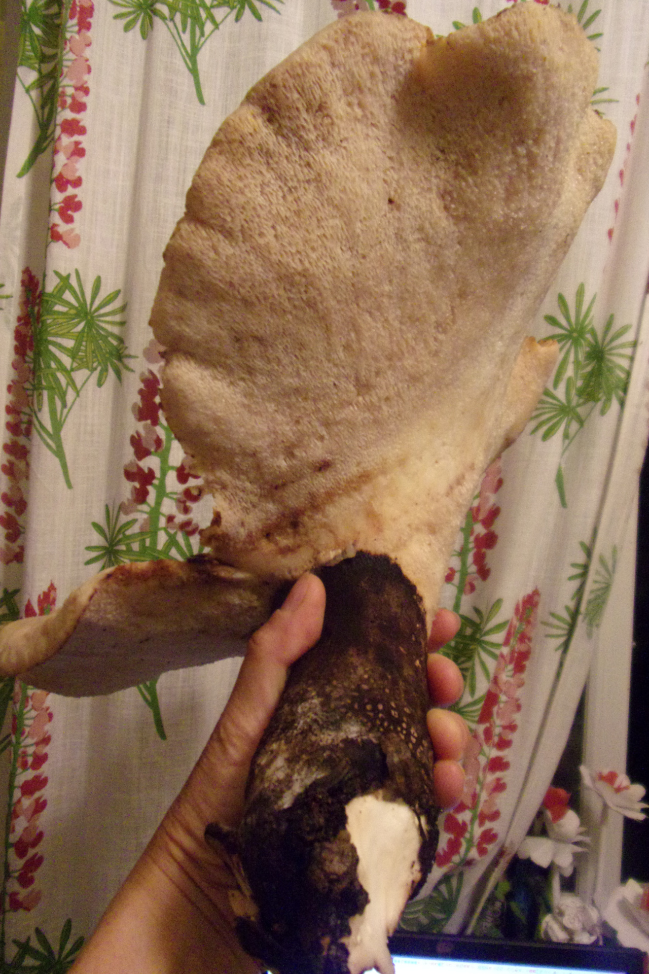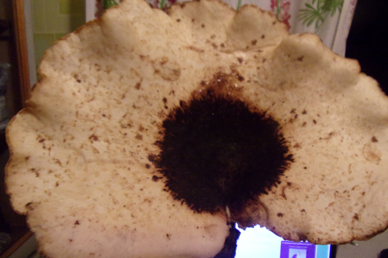 Описание гриба: Рос на ветхом пне американского клена . В лиственном лесу. Упругий, шляпку от ножки не оторвать, очень крепкий. Запах приятный, легкий, сладковатый. Толщина шляпки около 1 см, диаметр самой большой-30 см, на срезе-цвет белый, цвет не меняет . Ножка черная снаружи, внутри -белая.