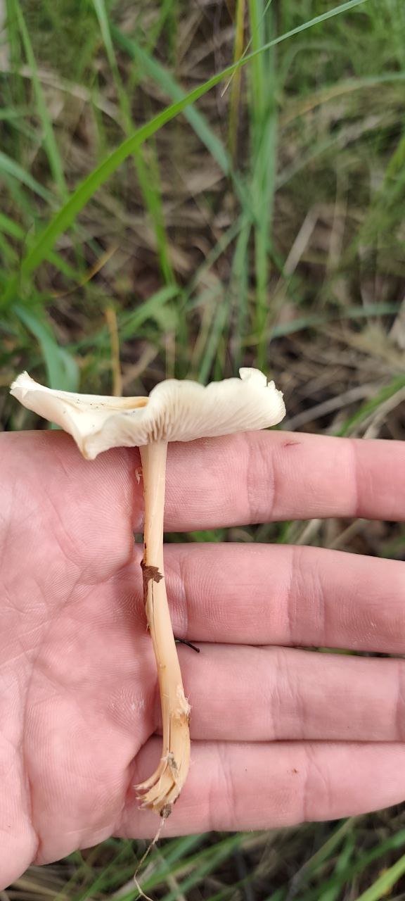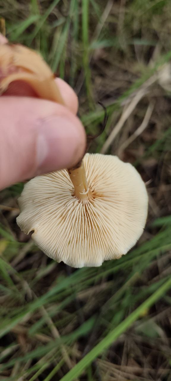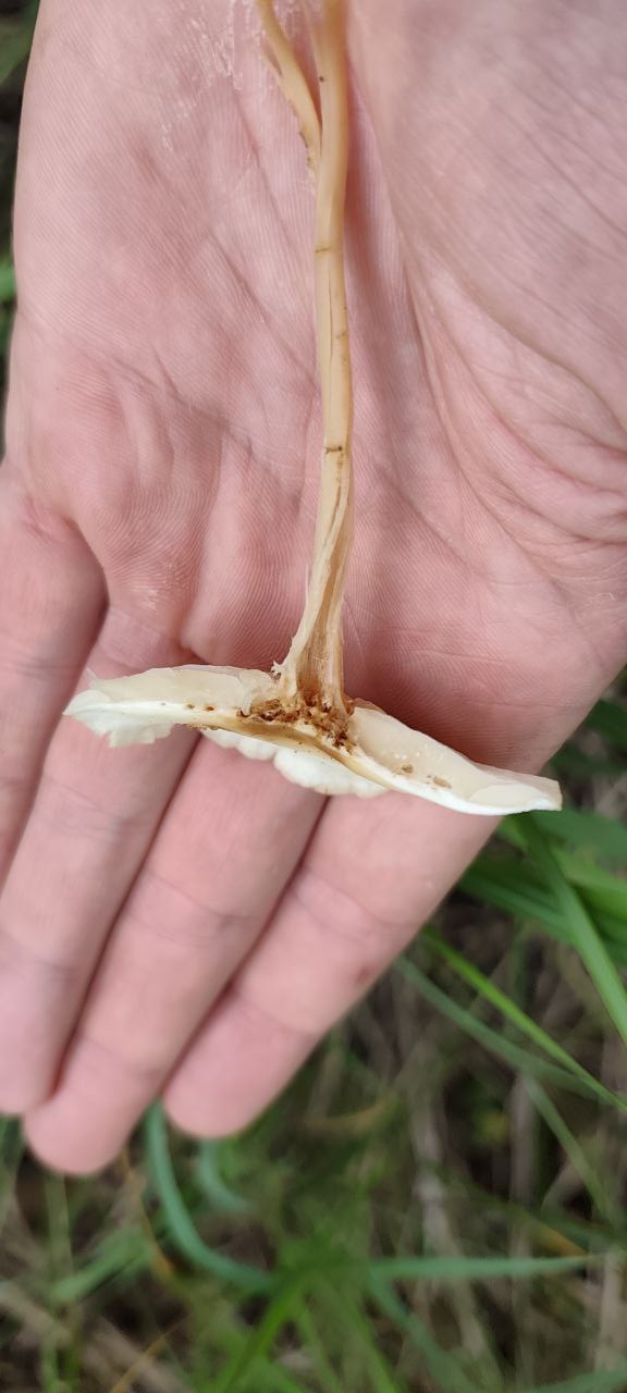 Описание гриба: Тульская область. Растут везде, и в смешанном лесу, и рядом в молодом березняке и дальше просто в поле попадаются. Растут массово, местные их не собирают. Ножка тонкая, полая внутри, пластинки частые, ярко выраженного запаха нет. Попадаются червивые (на фото с разрезом червивая шляпка). Что за гриб захватывает родные просторы?
