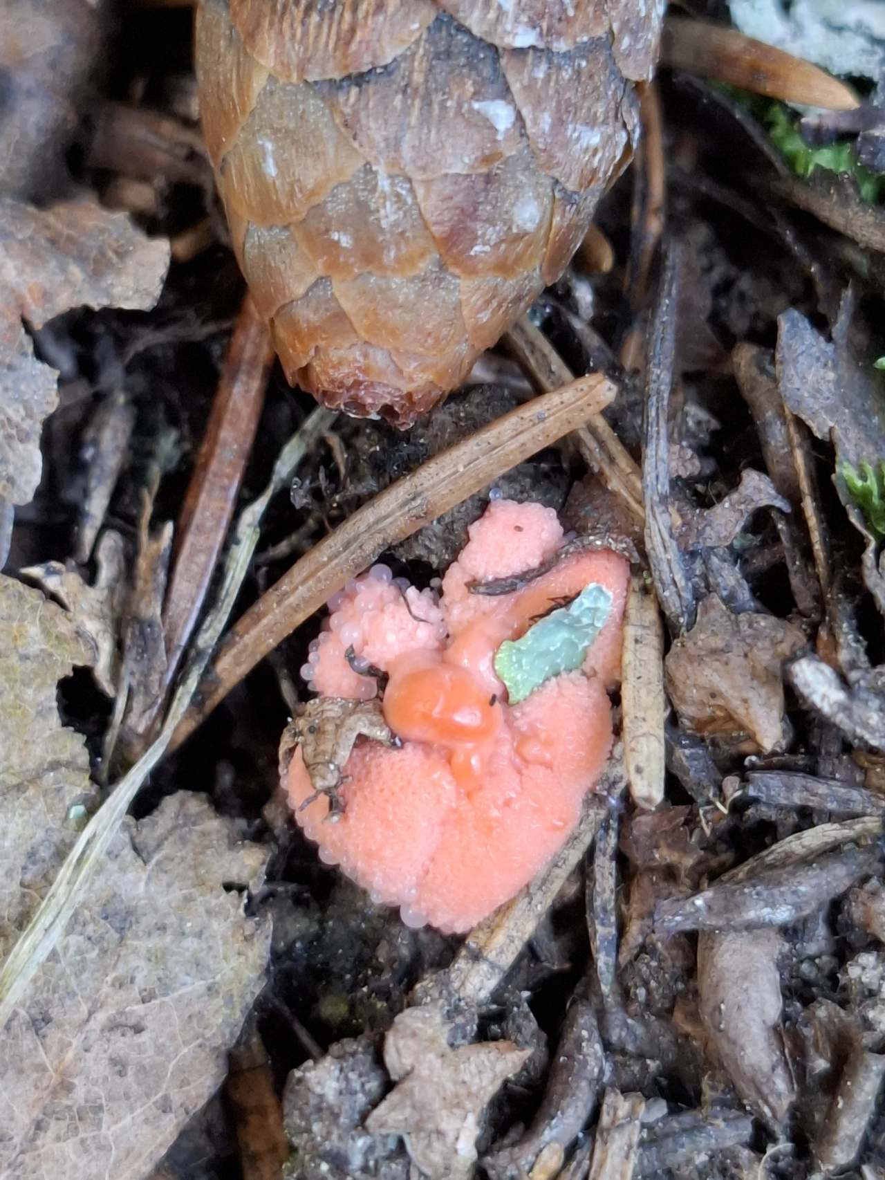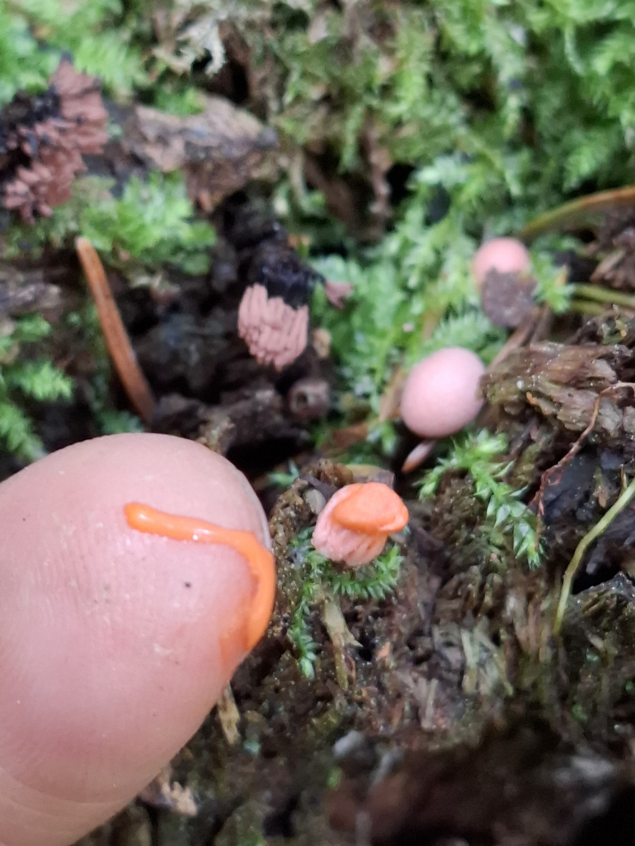 Описание гриба: Еловый лес. И пенёк из ели. Не пахнет и не воняет. При надавливании истекает жидкостью.
