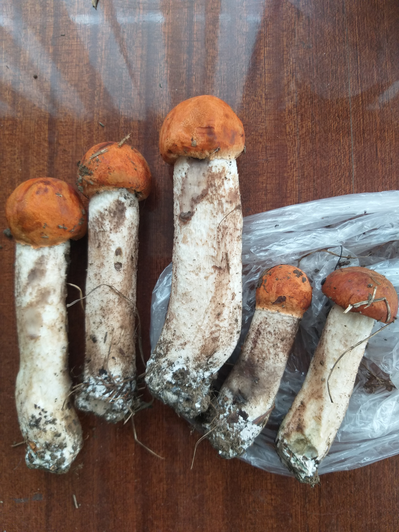 Описание гриба: Темно-оранжевая шляпка и белая ножка практически одного диаметра. У гриба справа шляпка немного другая почему-то.