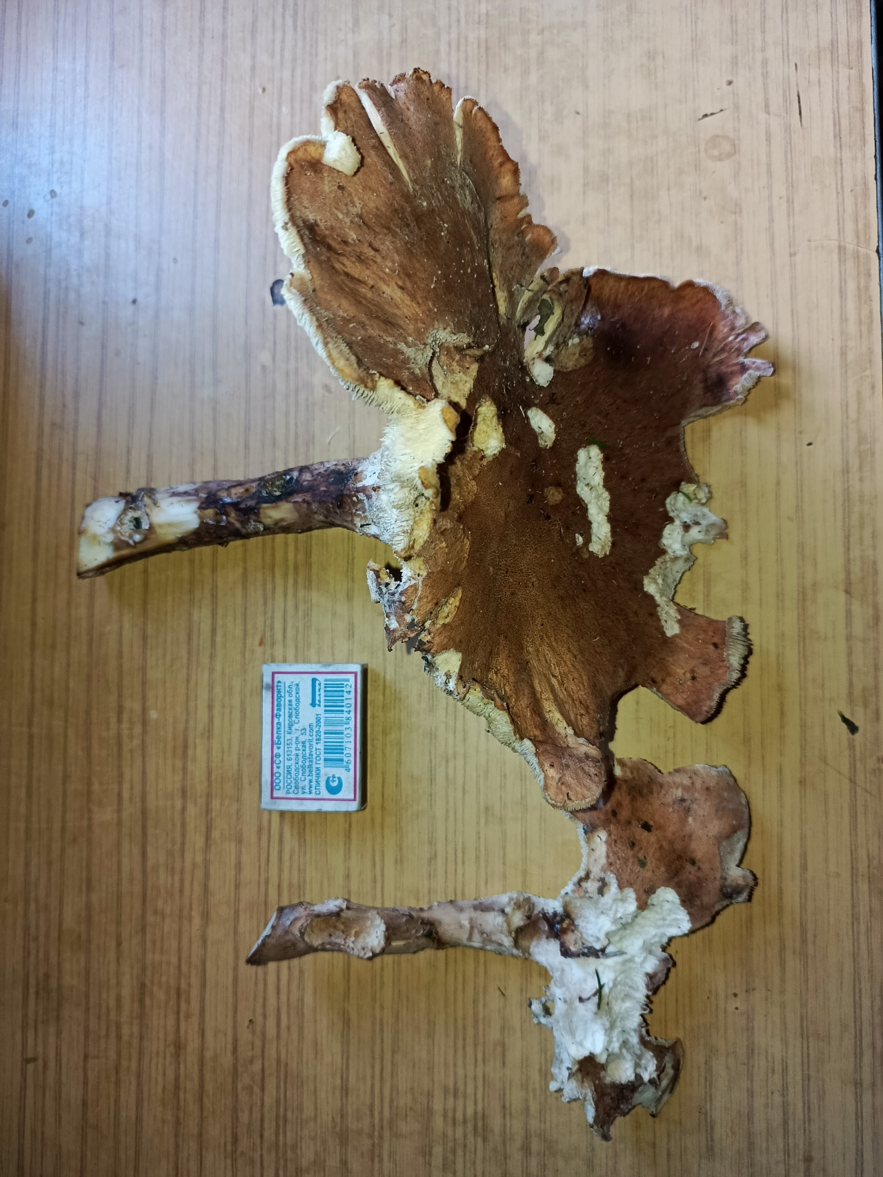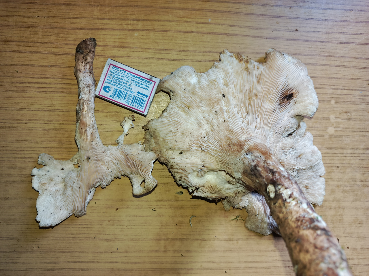 Описание гриба: Ножка дубовая, как ветка. Снизу споры, как у сыроежки. Сам гриб крепкий, тяжёлый. Ножка не горчит не темнеет.