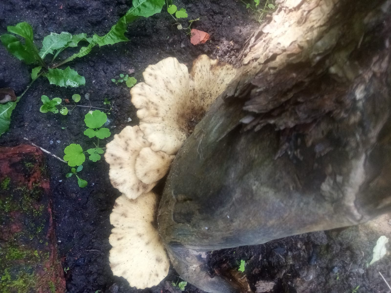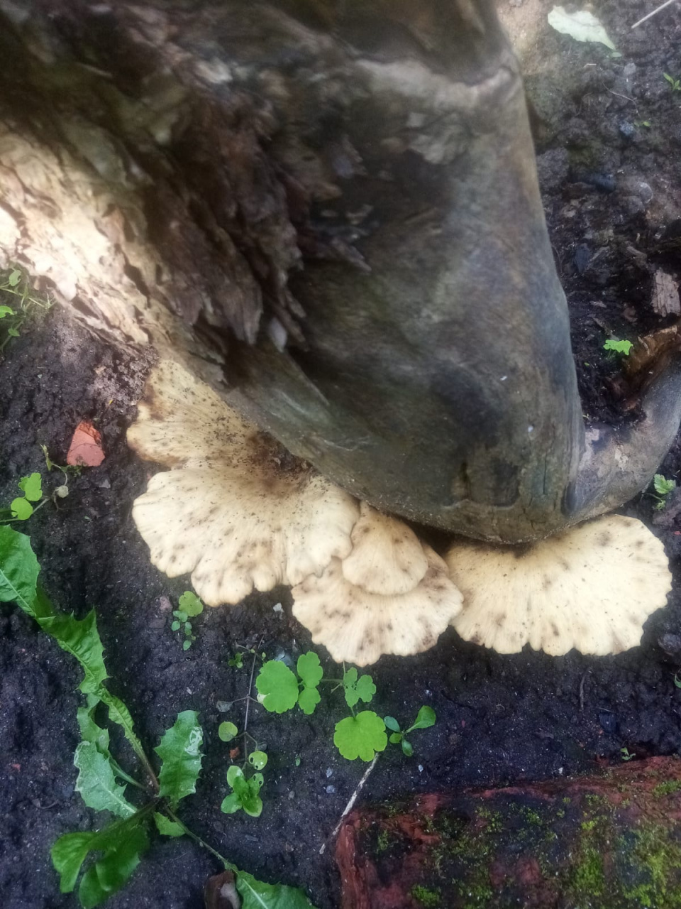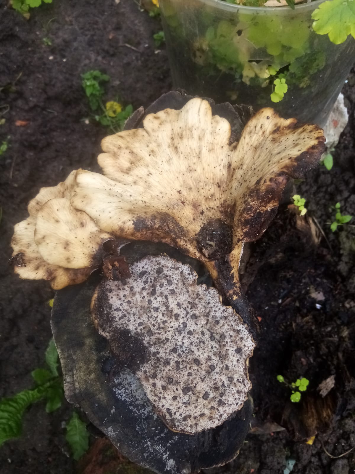Описание гриба: появились в саду на старом пне от яблони, светло-желтые в крапинку