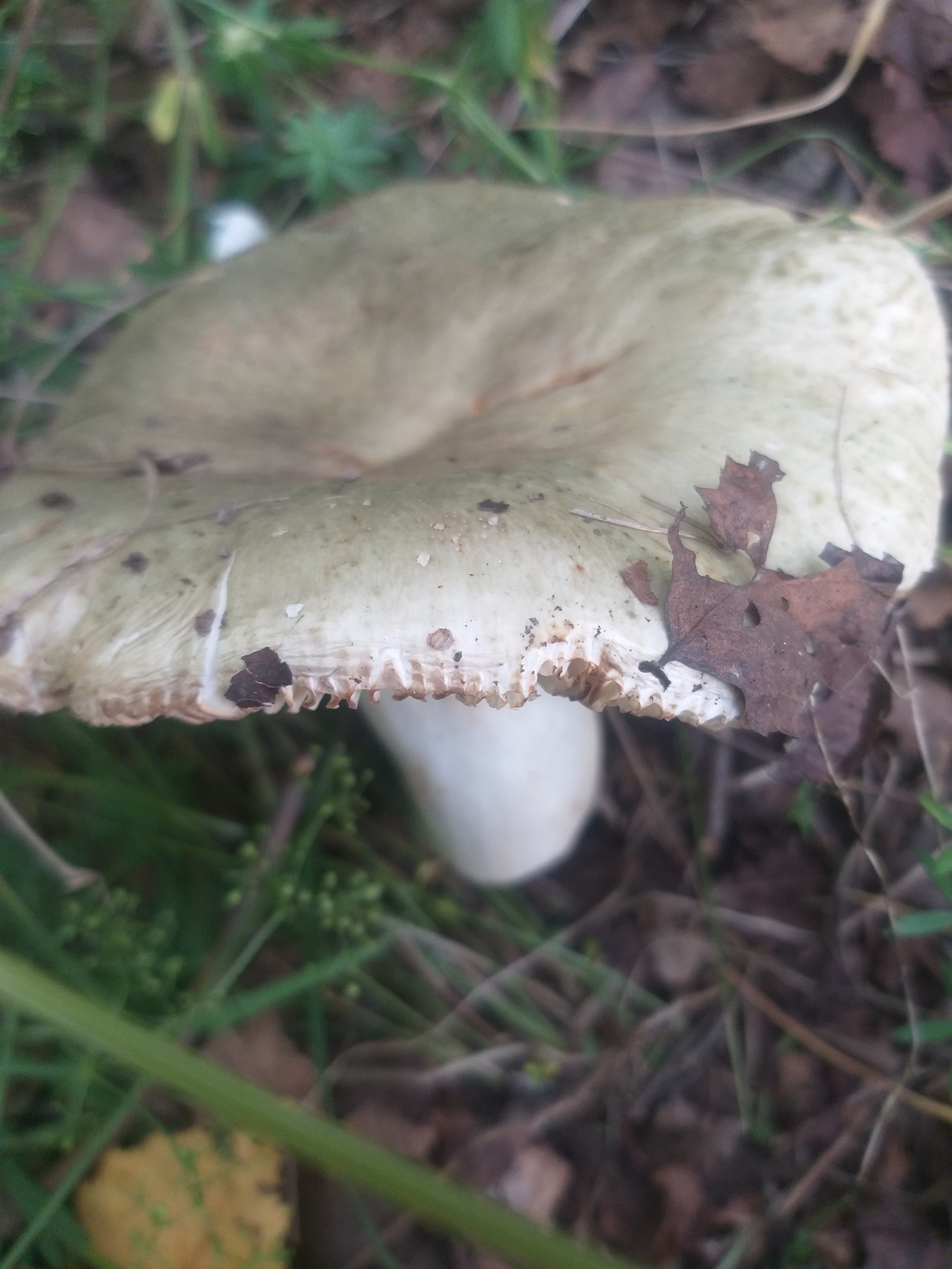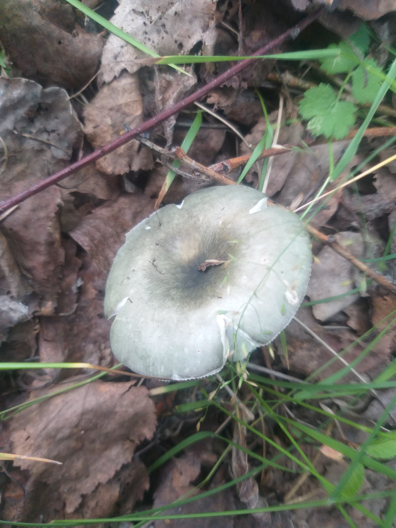 Это Сыроежки. Как варианты: Сыроежка зелёная (Russula aeruginea), Сыроежка чешуйчатая (Russula virescens), Сыроежка серая (Russula grisea).