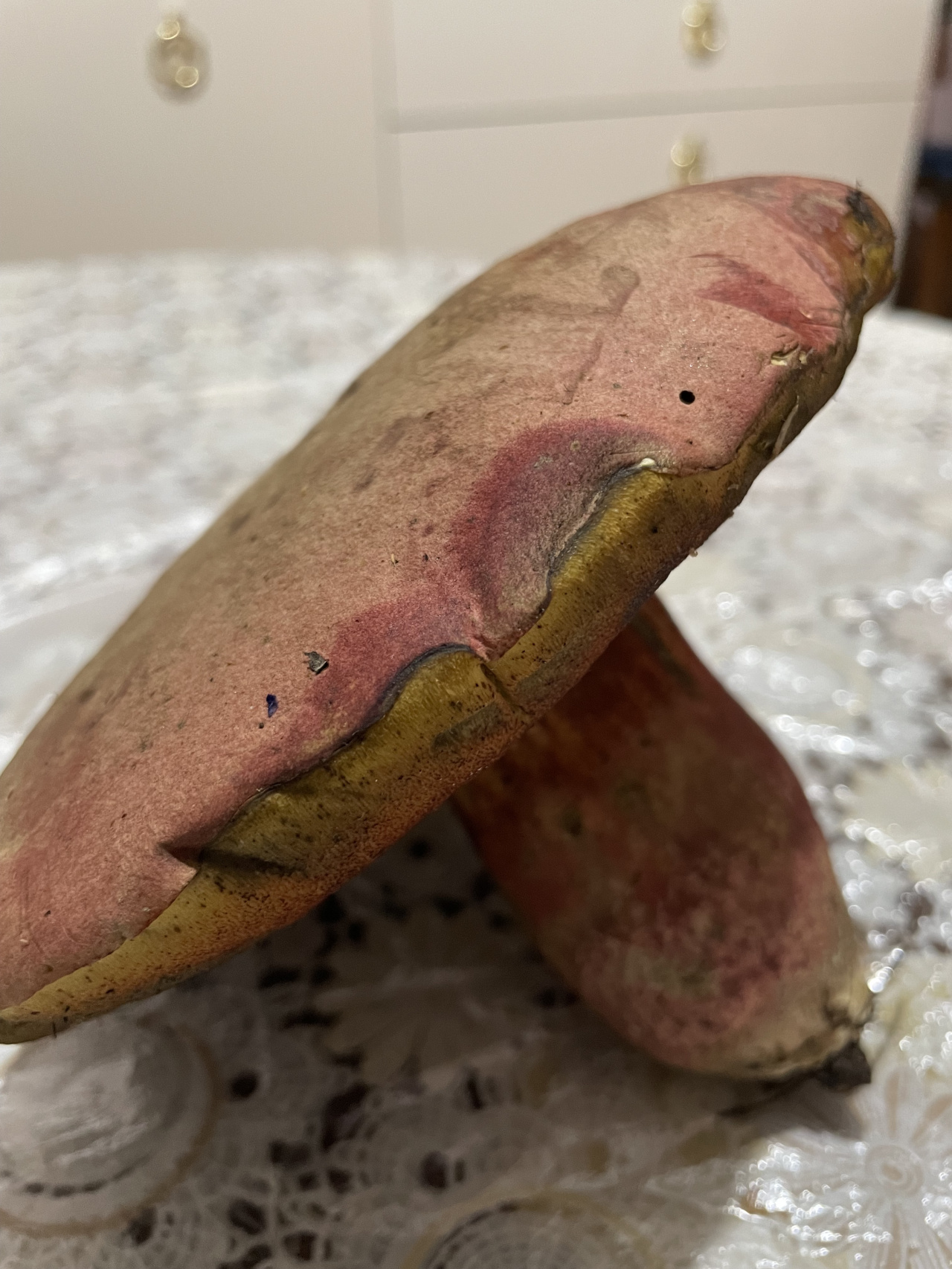Описание гриба: Розоватая шляпка и ножка с розовой сеткой, растет под дубами, синеет на срезе