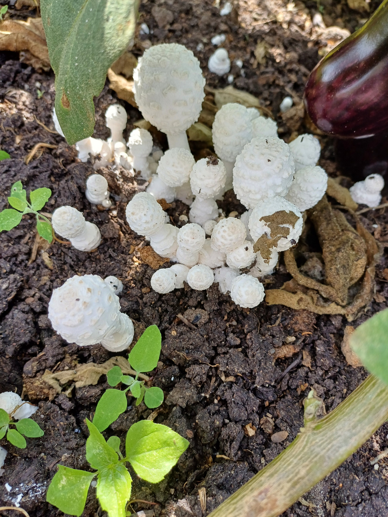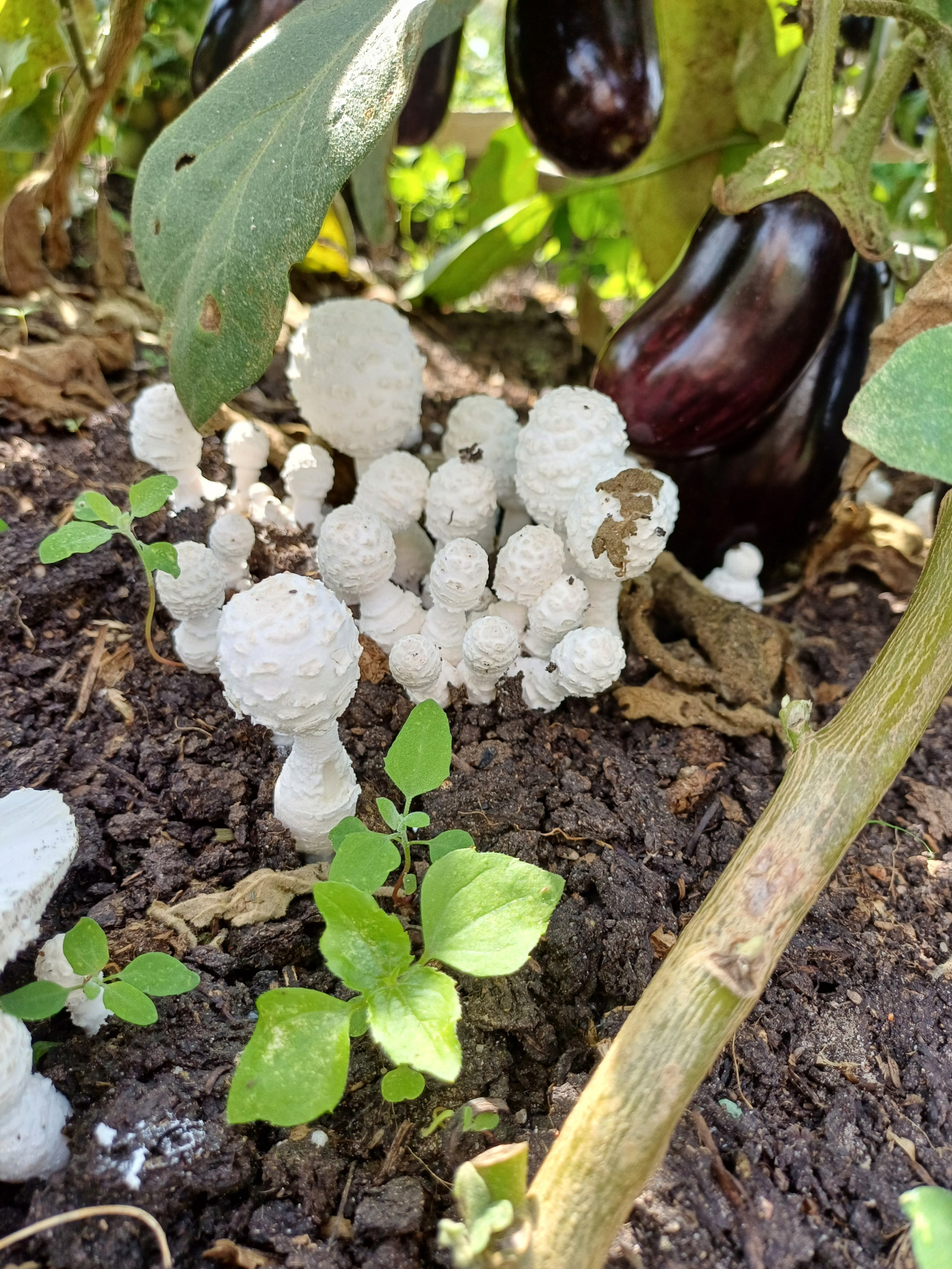 Описание гриба: Здравствуйте. Помогите, пожалуйста, распознать гриб. Выросли в большом количестве на грядке с баклажанами. Грядка была очень хорошо заправлена перегноем. Растут кучками. .