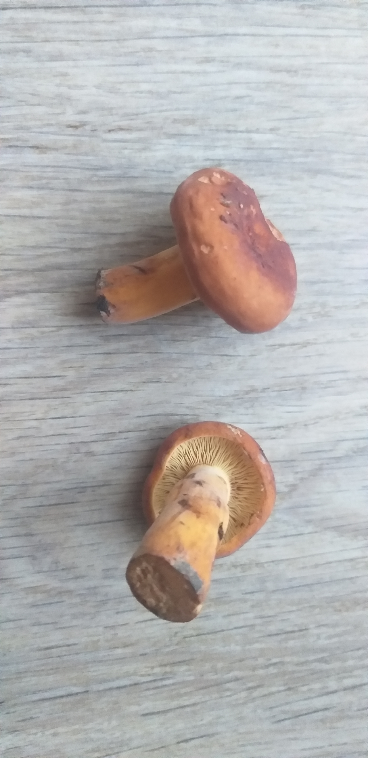 Описание гриба: Шляпка бархатистая.Цвет шляпки коричнево- красноватый, как охра.Шляпка по центру вогнутая, имеет легкие концентрические круги, низ шляпки книзу загнут вовнутрь.Снизу шляпки пластинки.Ножка по цвету чуть светлее шляпки.Сам гриб плотный, крепкий.При срезе выделяется белый млечный сок.У гриба ароматный грибной запах.После того как полежал немного потемнел срез и места примятостей шляпки пластинок снизу.