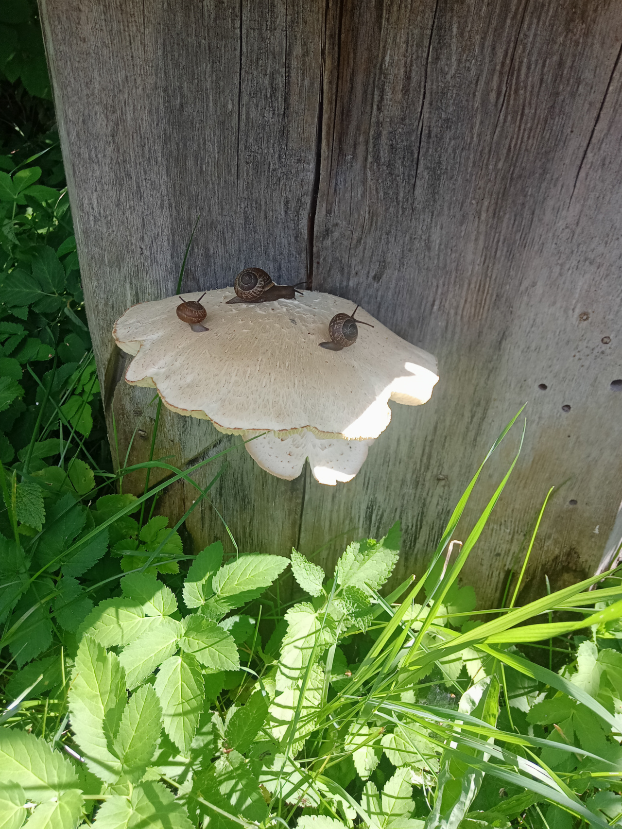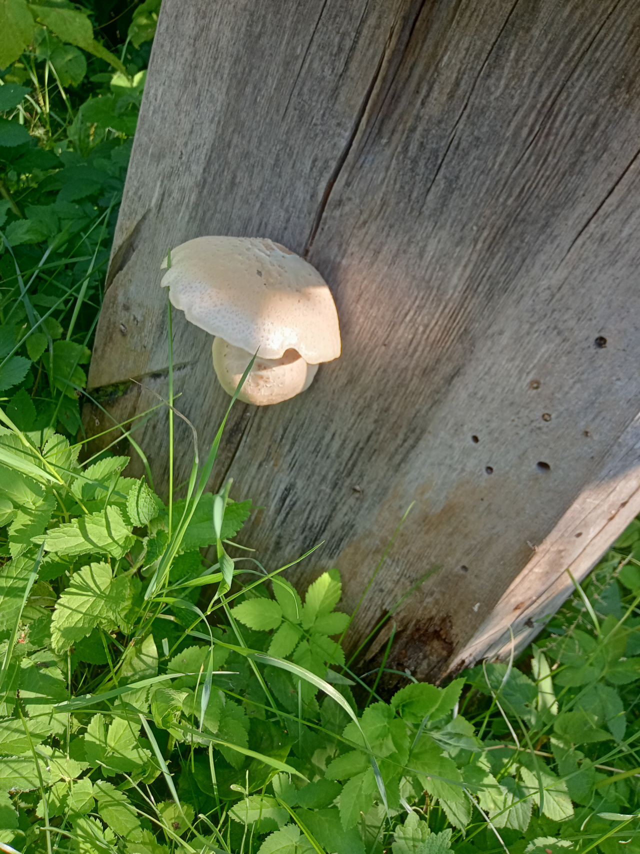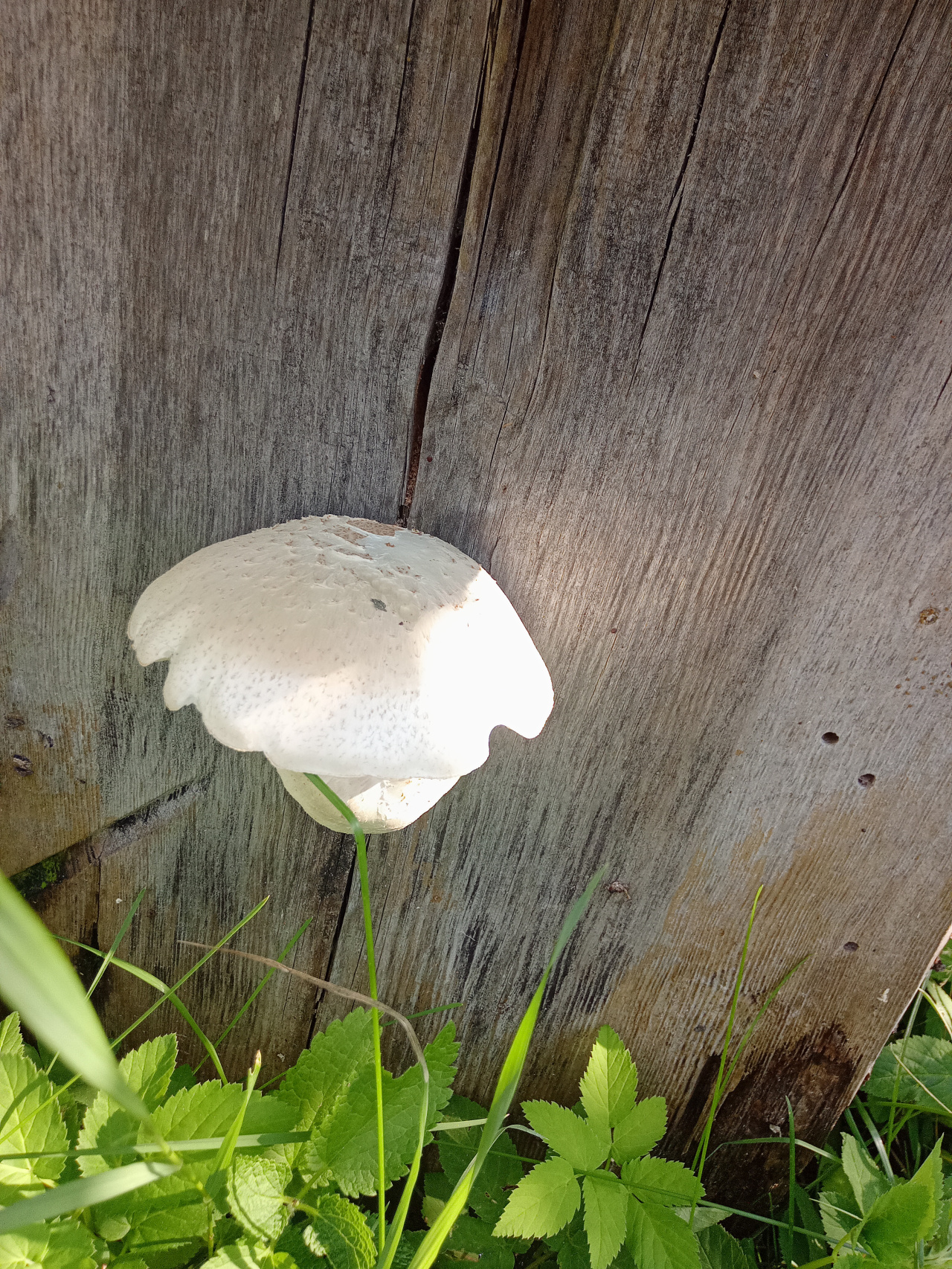 Описание гриба: Достаточно большой гриб, с диаметром шляпки 12 — 14 сантиметров, весь белого цвета, с короткой ножкой, пластинчатый, вырос на старом пне, очищенном от коры.