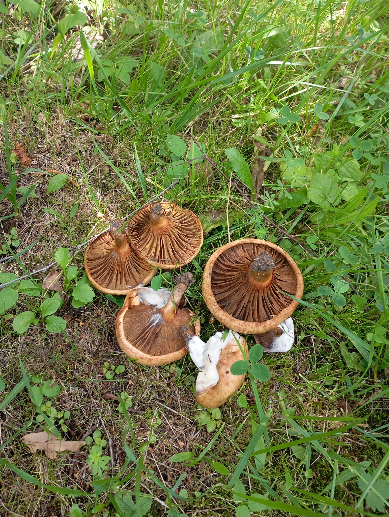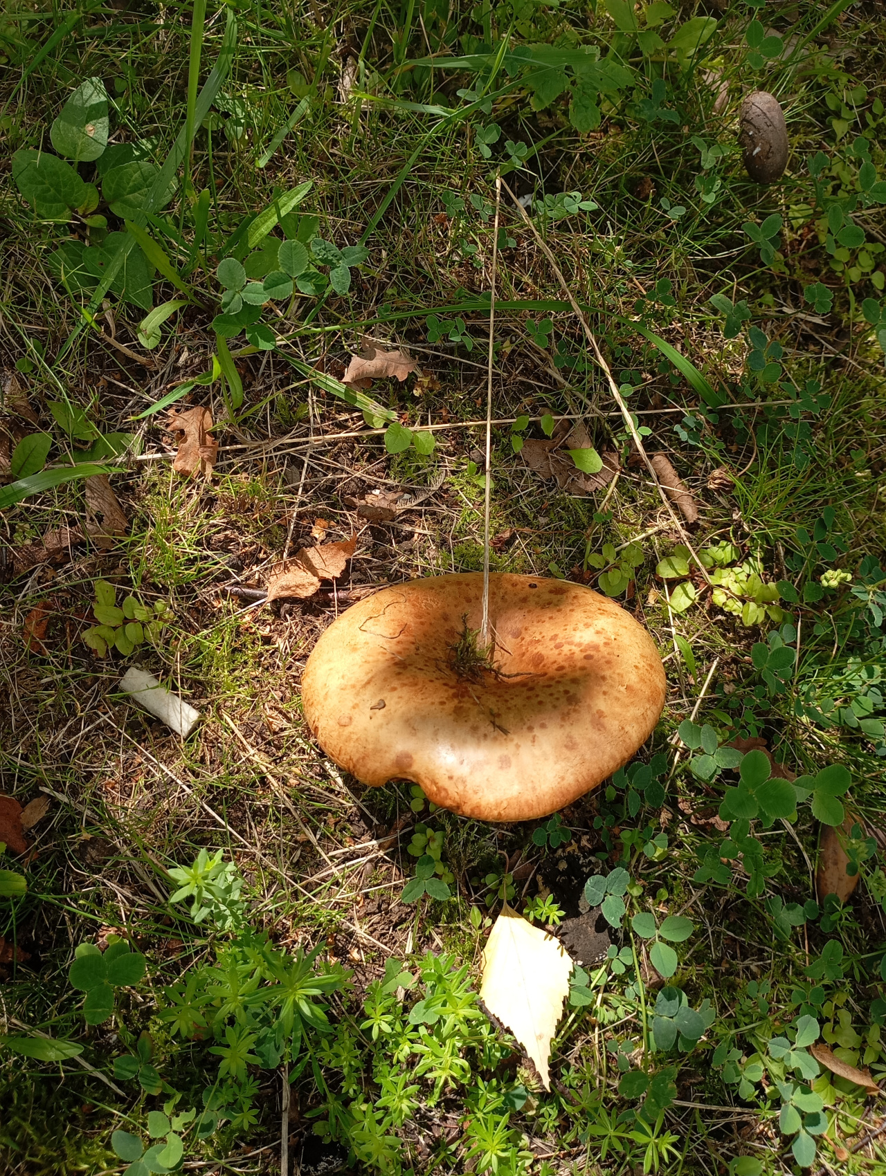 Описание гриба: Коричневый, с коричневыми пластинками, росли кругом около берёзы