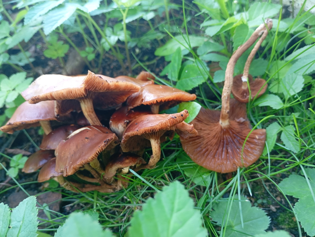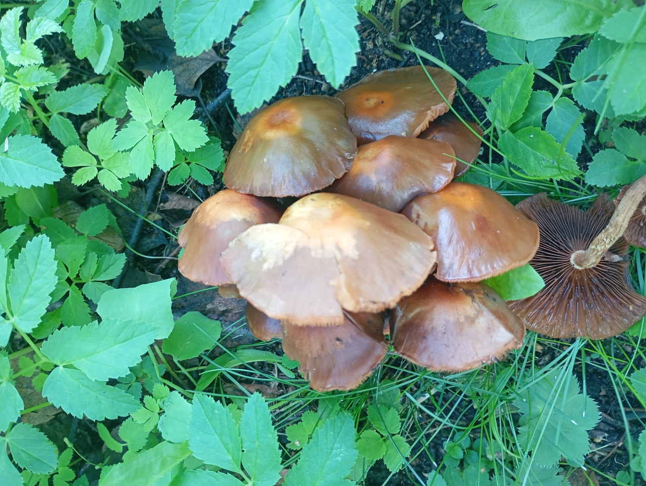 Описание гриба: Коричневый гриб, пластинчатый, шляпка с рваными краями и светлым пятном в центре. Пластинчатый гриб, пластинки коричневые. Юбочки нет. Растут в траве.