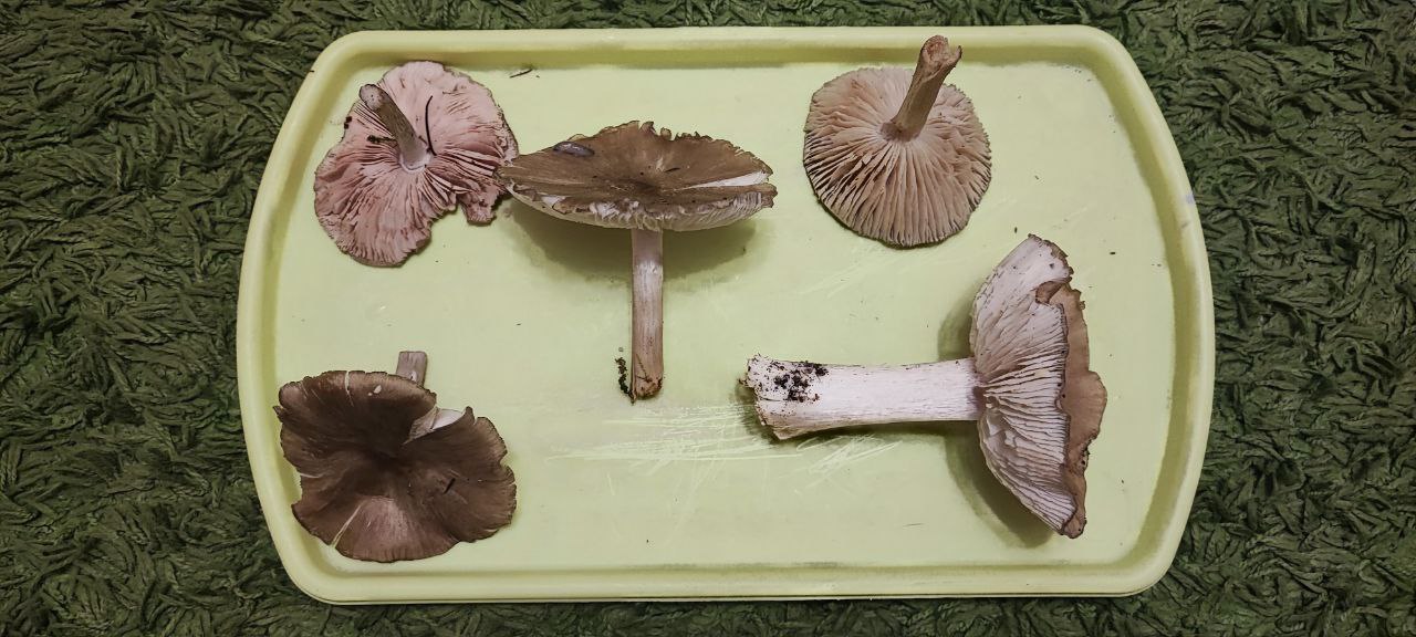 У вас разные грибы. Слева вверху — плютей (вероятно, олений). В центре — мегаколлибия широкопластинчатая. Остальные 3 гриба нужно изучать с других ракурсов.