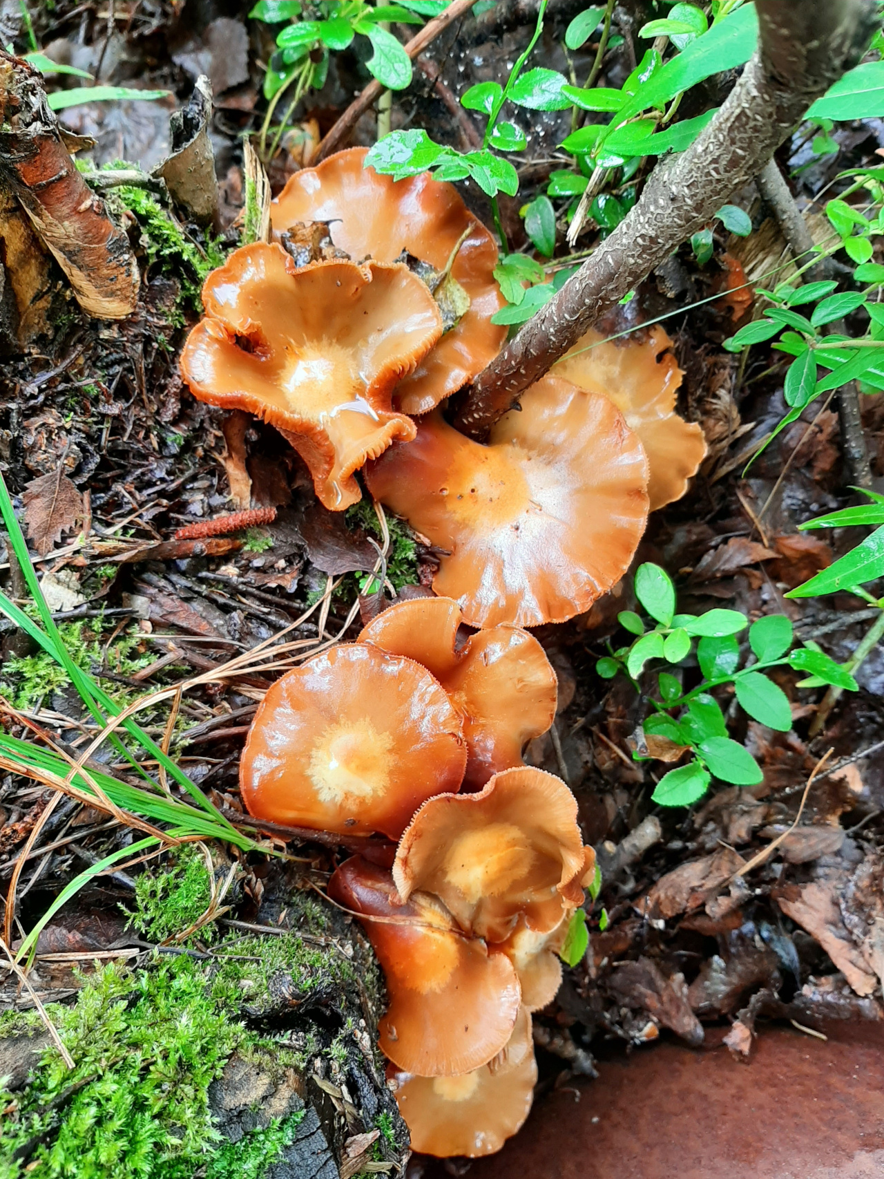 Описание гриба: Здравствуйте.Помогите определить гриб. Растёт на берёзовых пнях. Запах приятный, грибной. Лес смешанный. Фото после дождя.