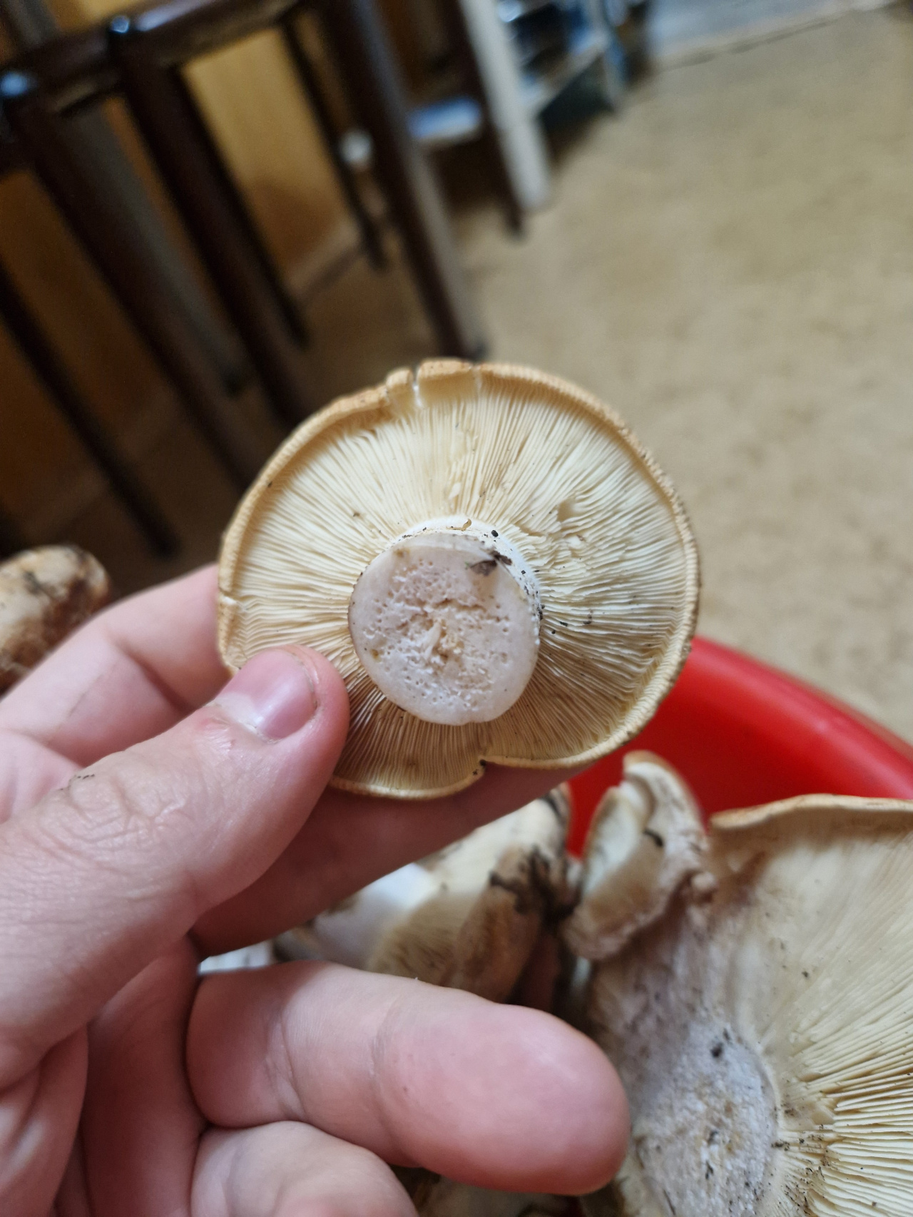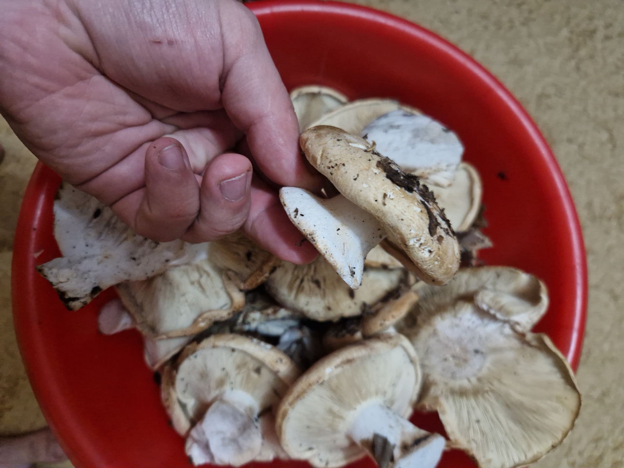 Собрали много вёдер обычных груздей, и одно ведёрко таких, этот вроде похож на подгруздки, без млечного сока, ножка плотная и цельная, шляпка сухая и слегка бархатная. Но смущает только то что она ровная и плоская, без углубления