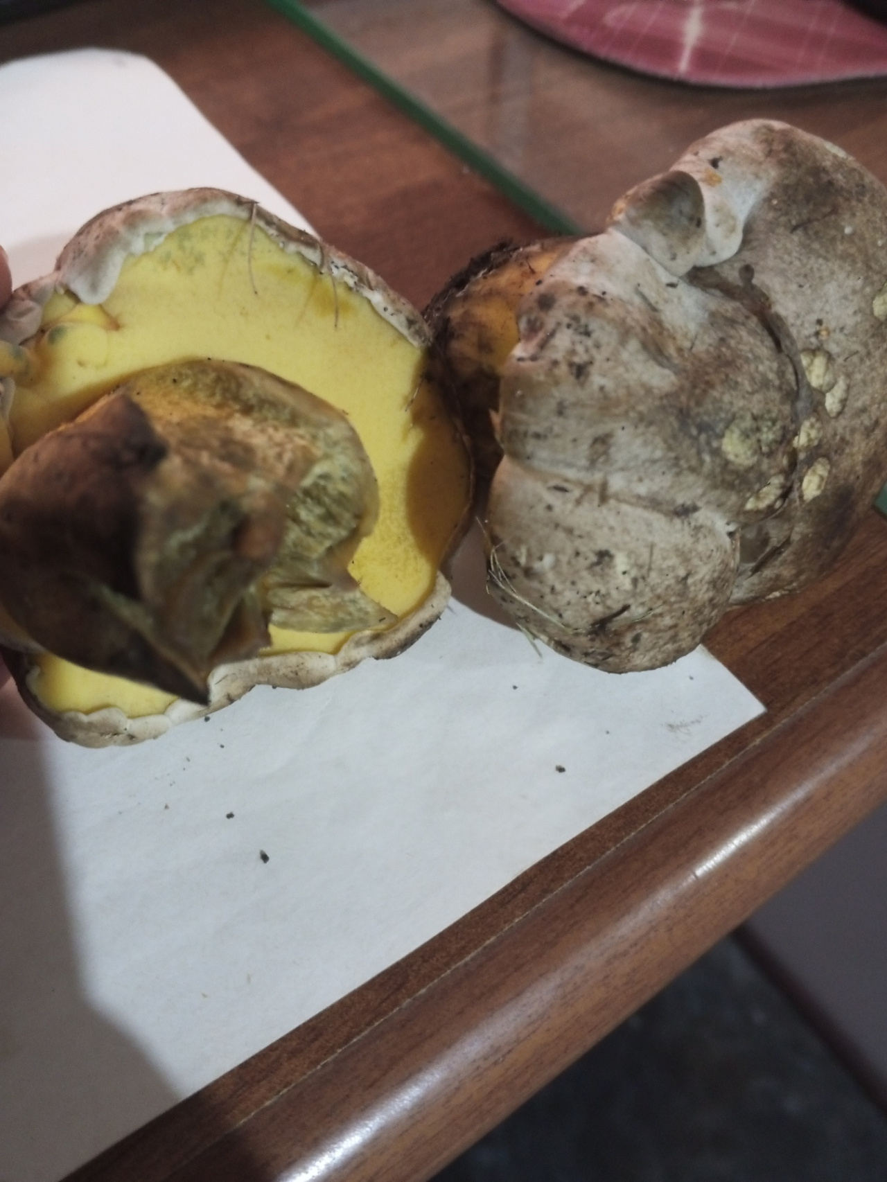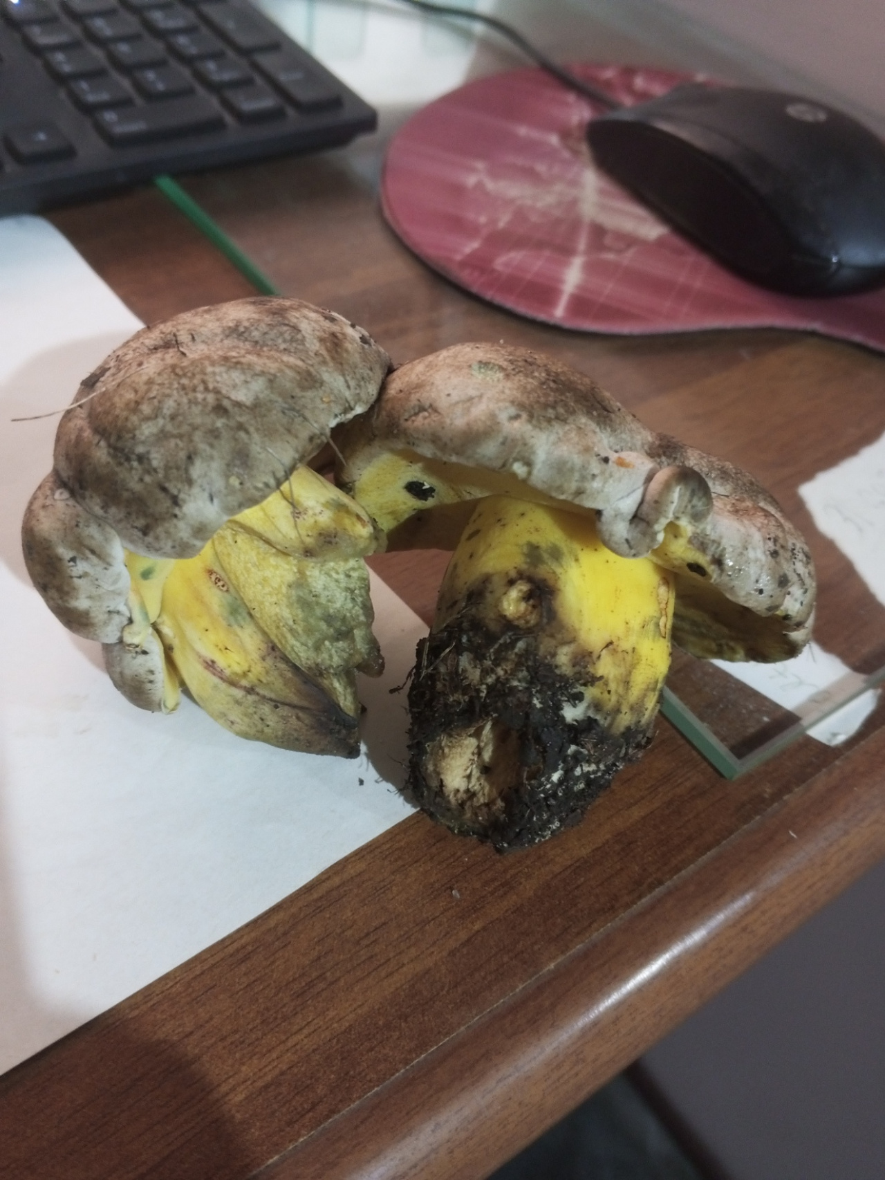 Описание гриба: московская область, г.о. Домодедово лес смешанный поляна под дубом шляпка серо-оливковая, желтые ножка и трубчатый слой, мякоть белая — синеет, трубчатый слой на изломе жёлтый, запах грибной
