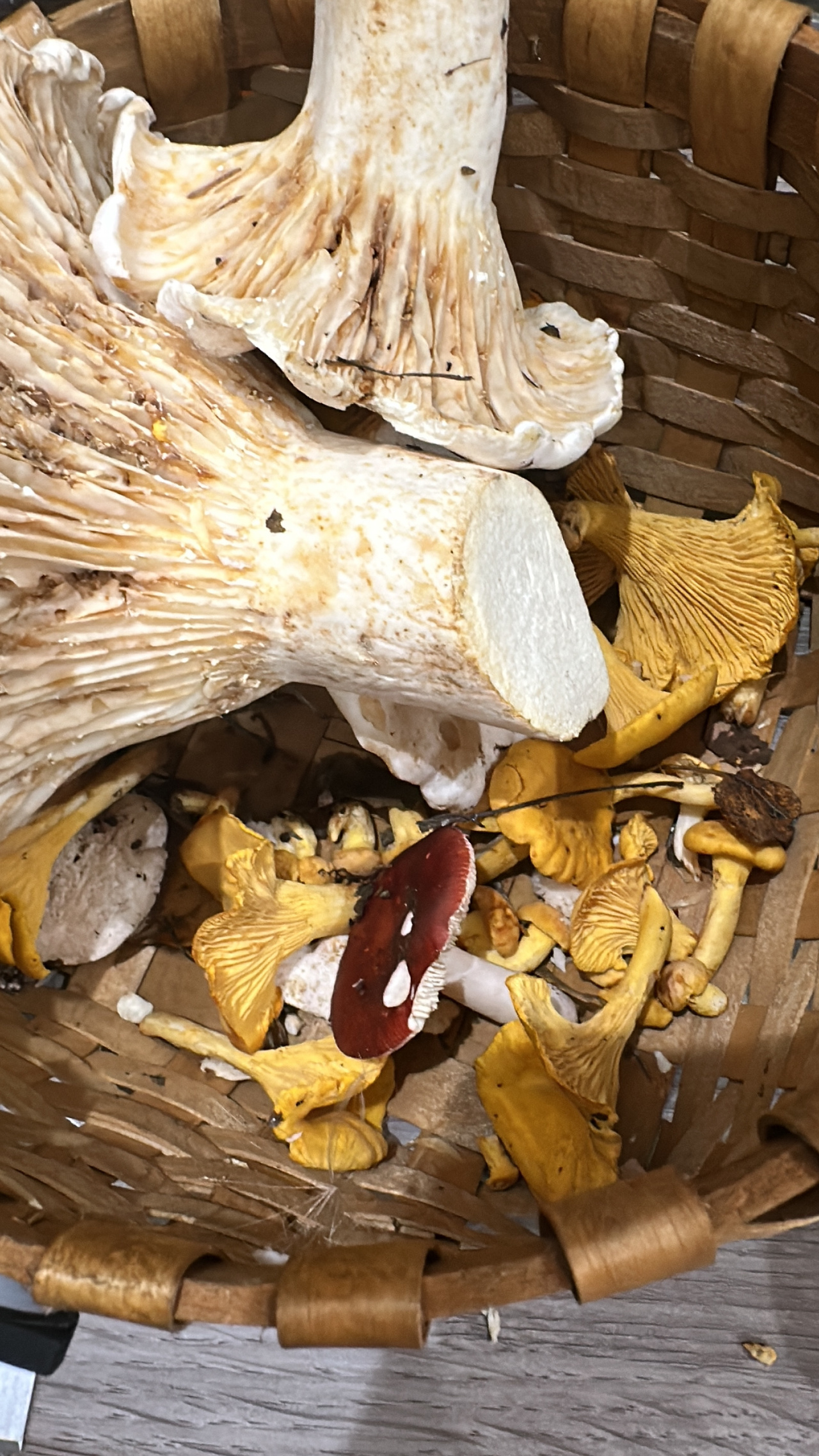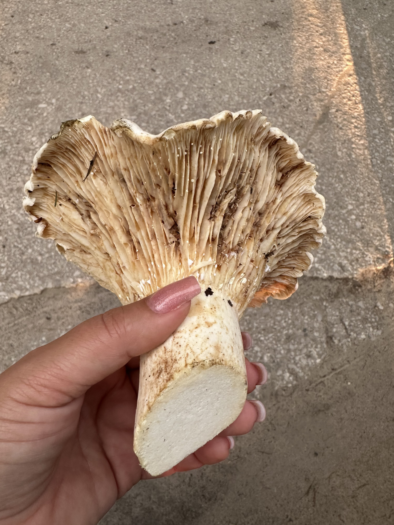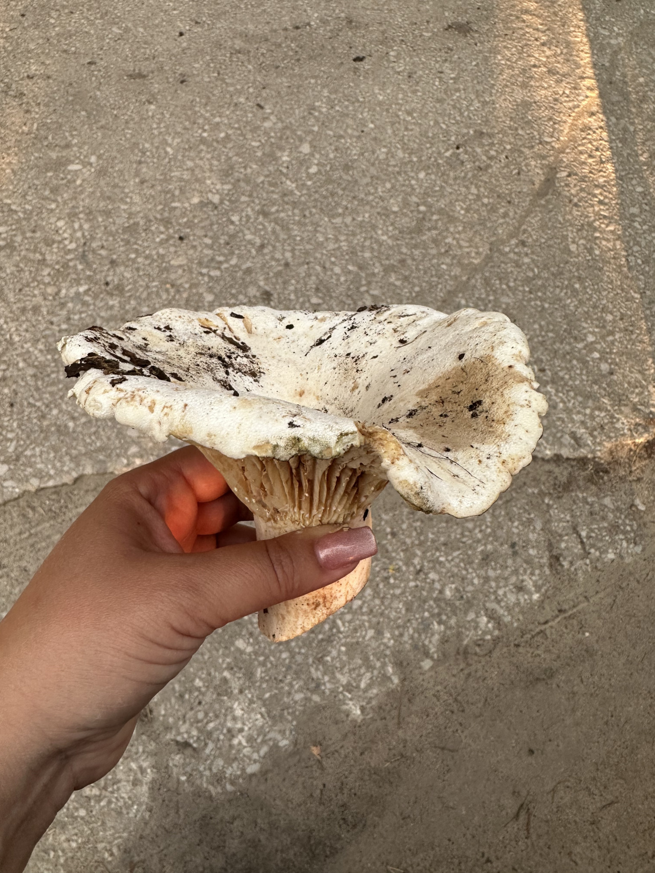 Описание гриба: Запах приятный грибной, лес смешанный, ножка плотная, шляпка твердая, поастинчатая. Похож на большую лисичку, только белого цвета.