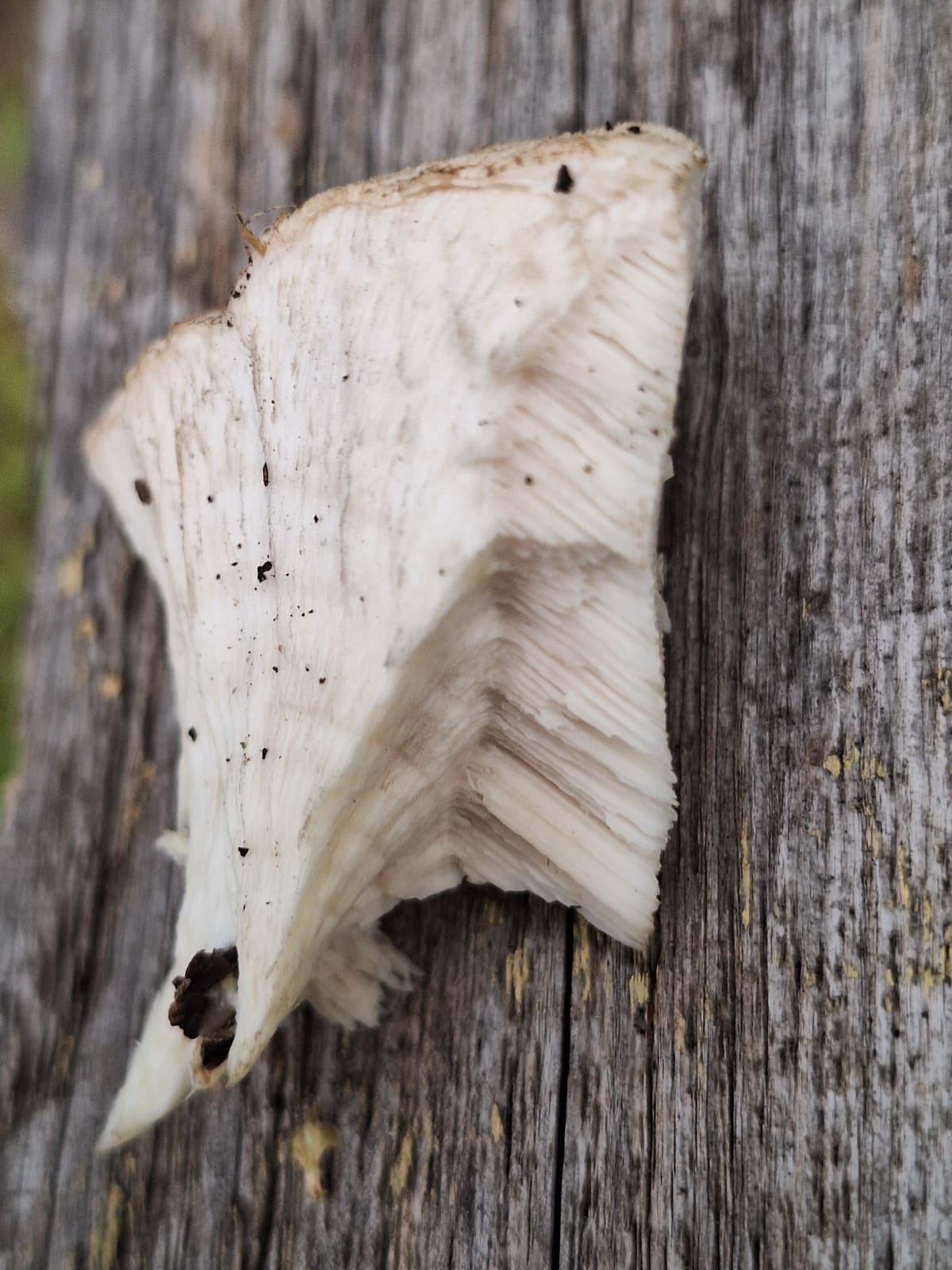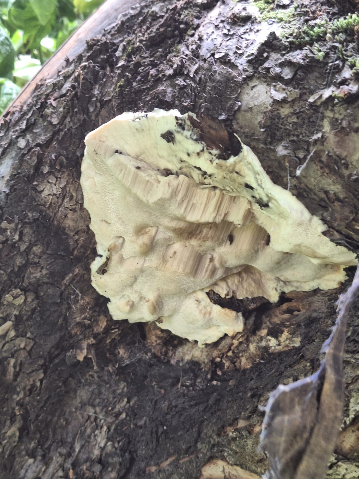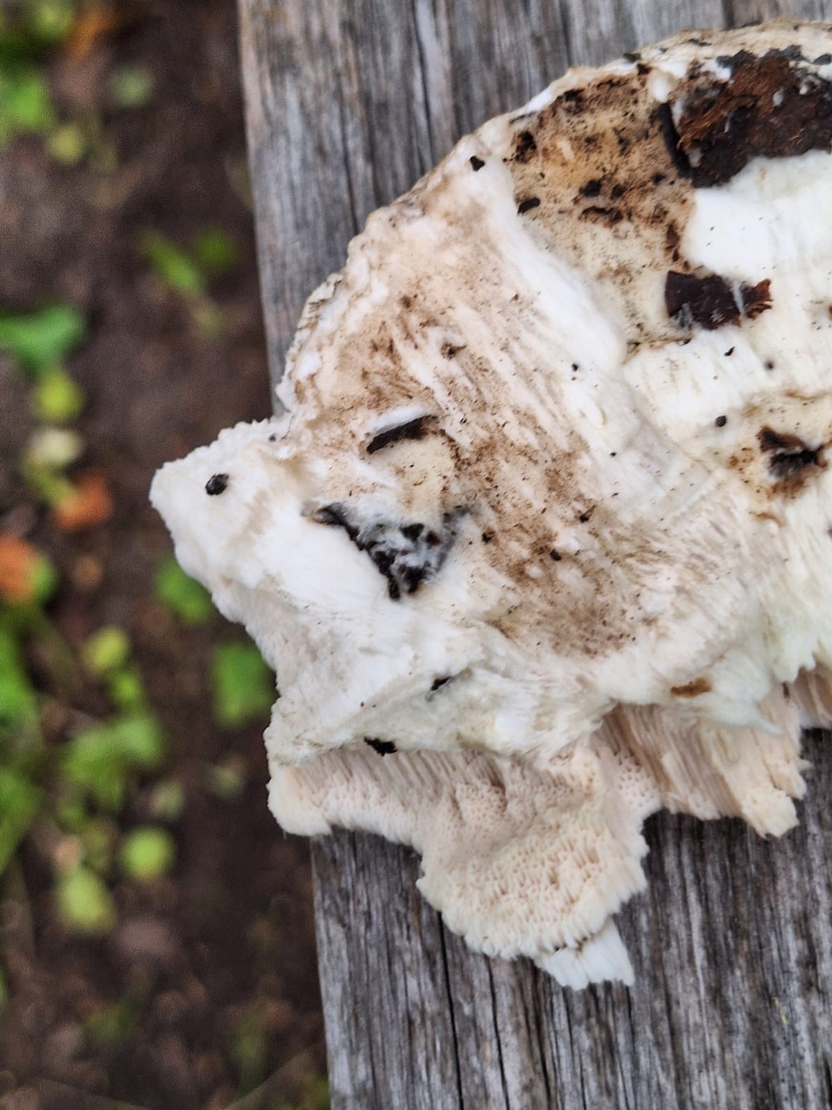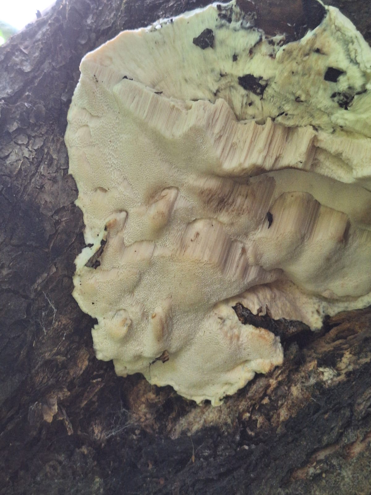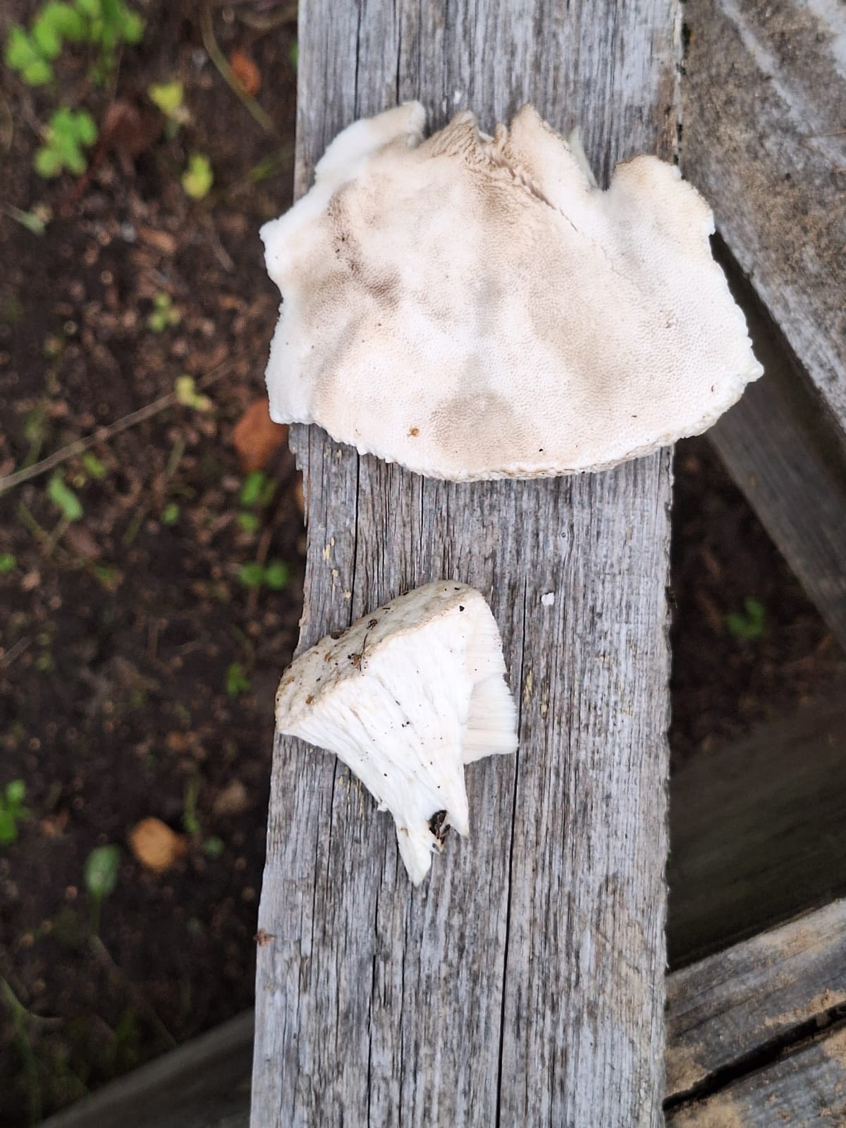 Описание гриба: Вырос на старой яблоне на садовом участке под Москвой. Белый, с белым трубчатым слоем. Запаха нет. На ощупь — как обычный гриб.