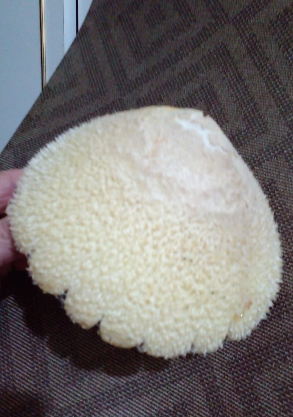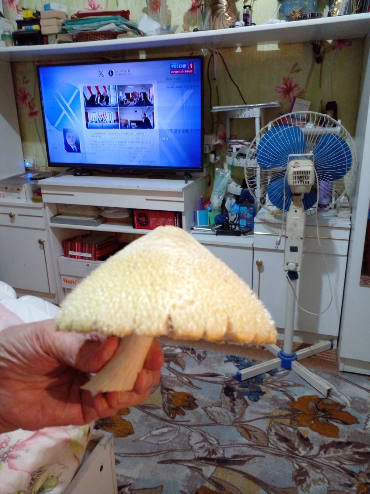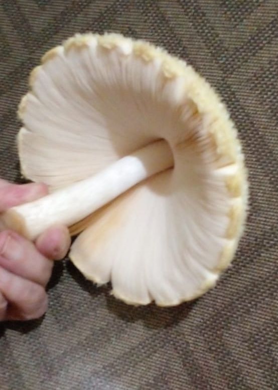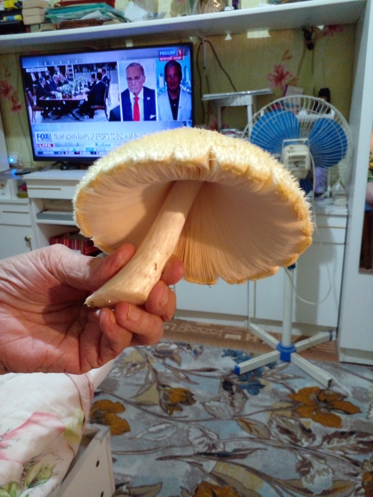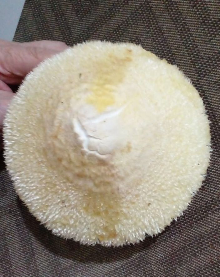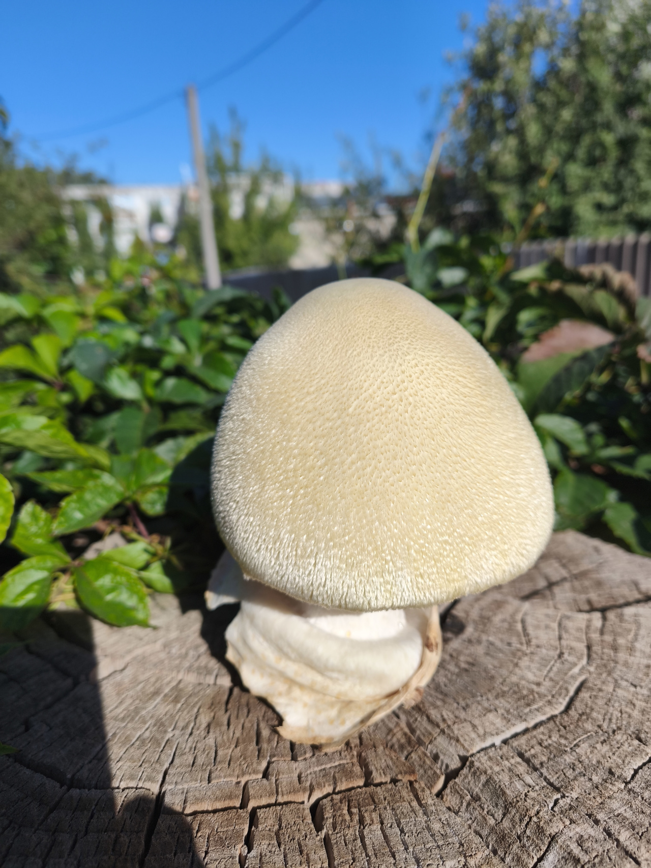 Описание гриба: Гриб весь белый (желтоватый), в диаметре 14 см. Такое впечатление, что он на поверхности ворсистый, без юбки. пластинки высотой около 1 см. Вырос вплотную с спиленному пню вяза в тени во дворе.