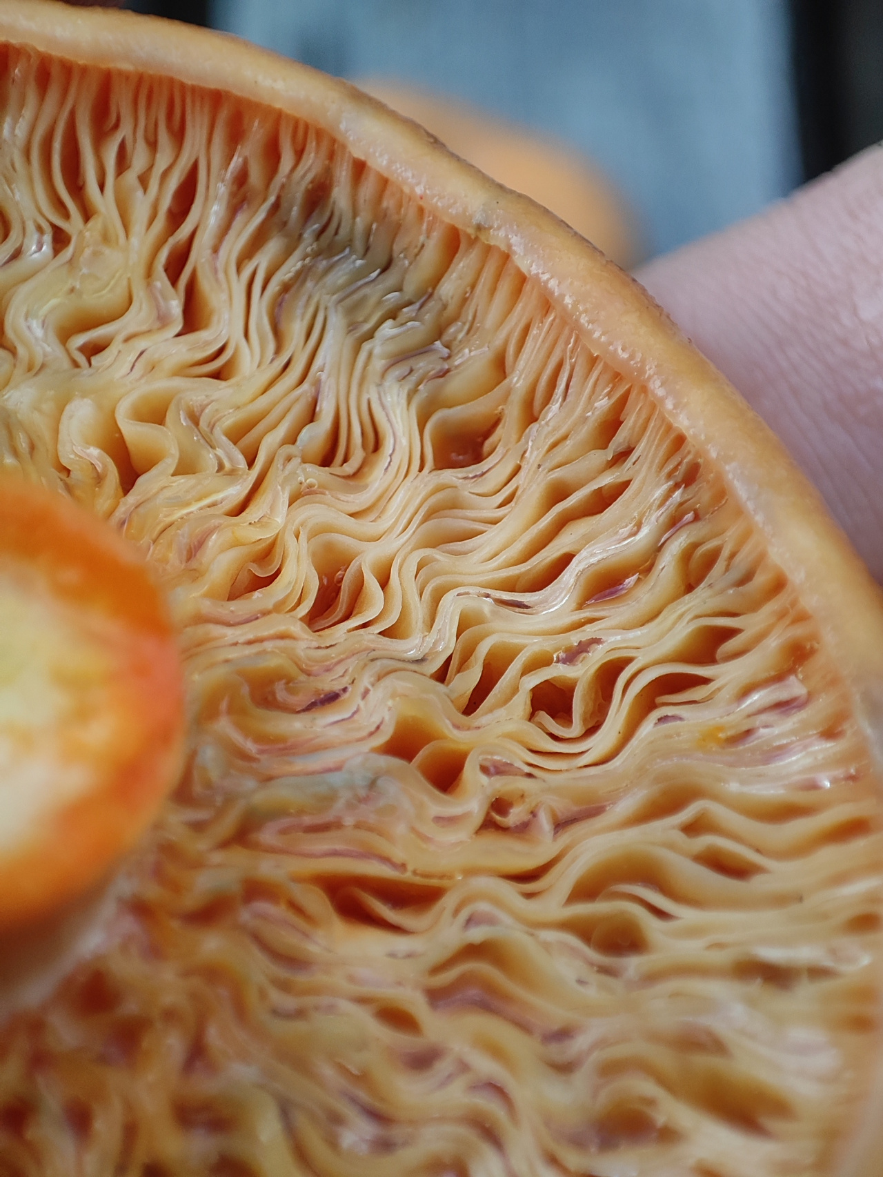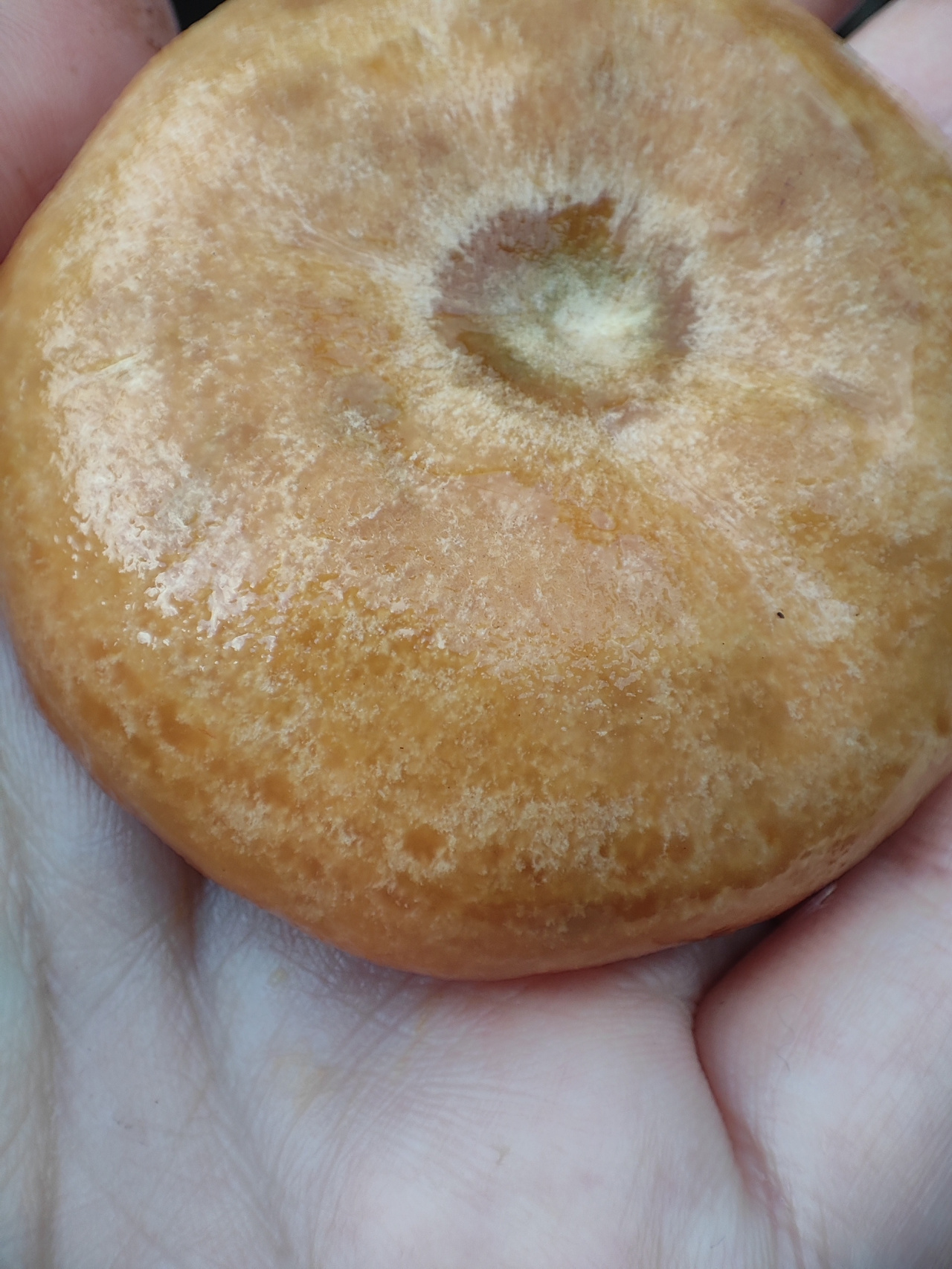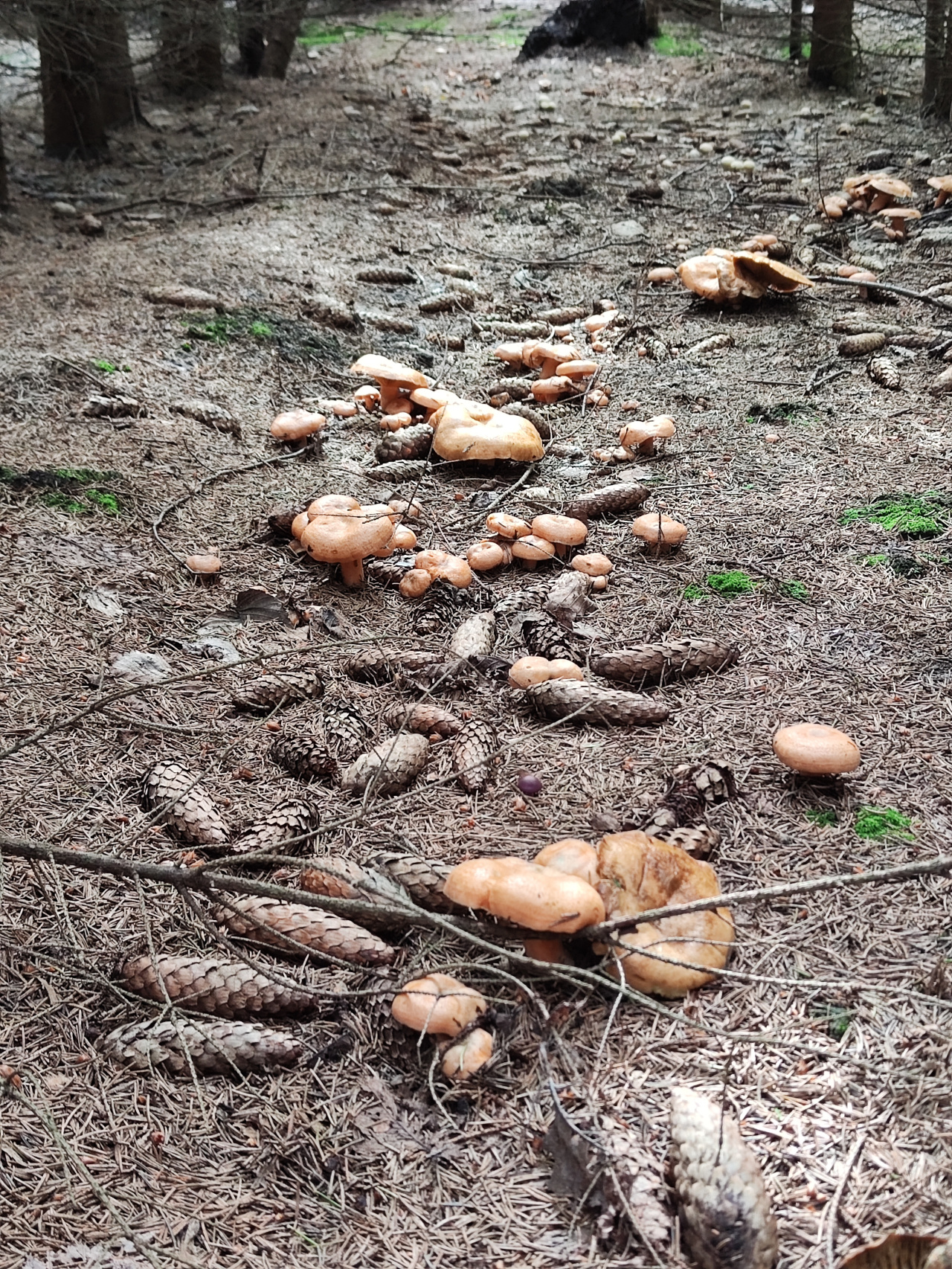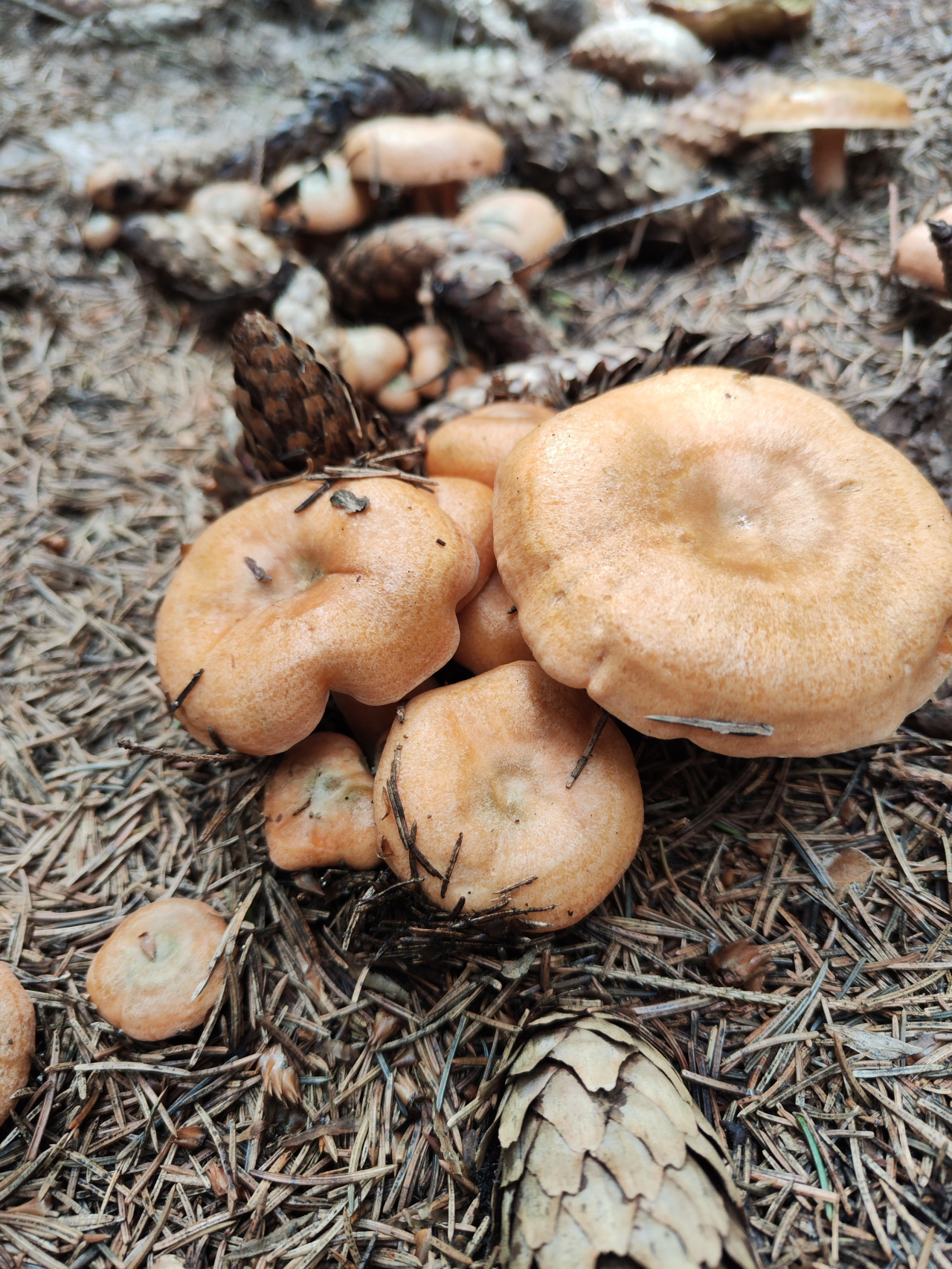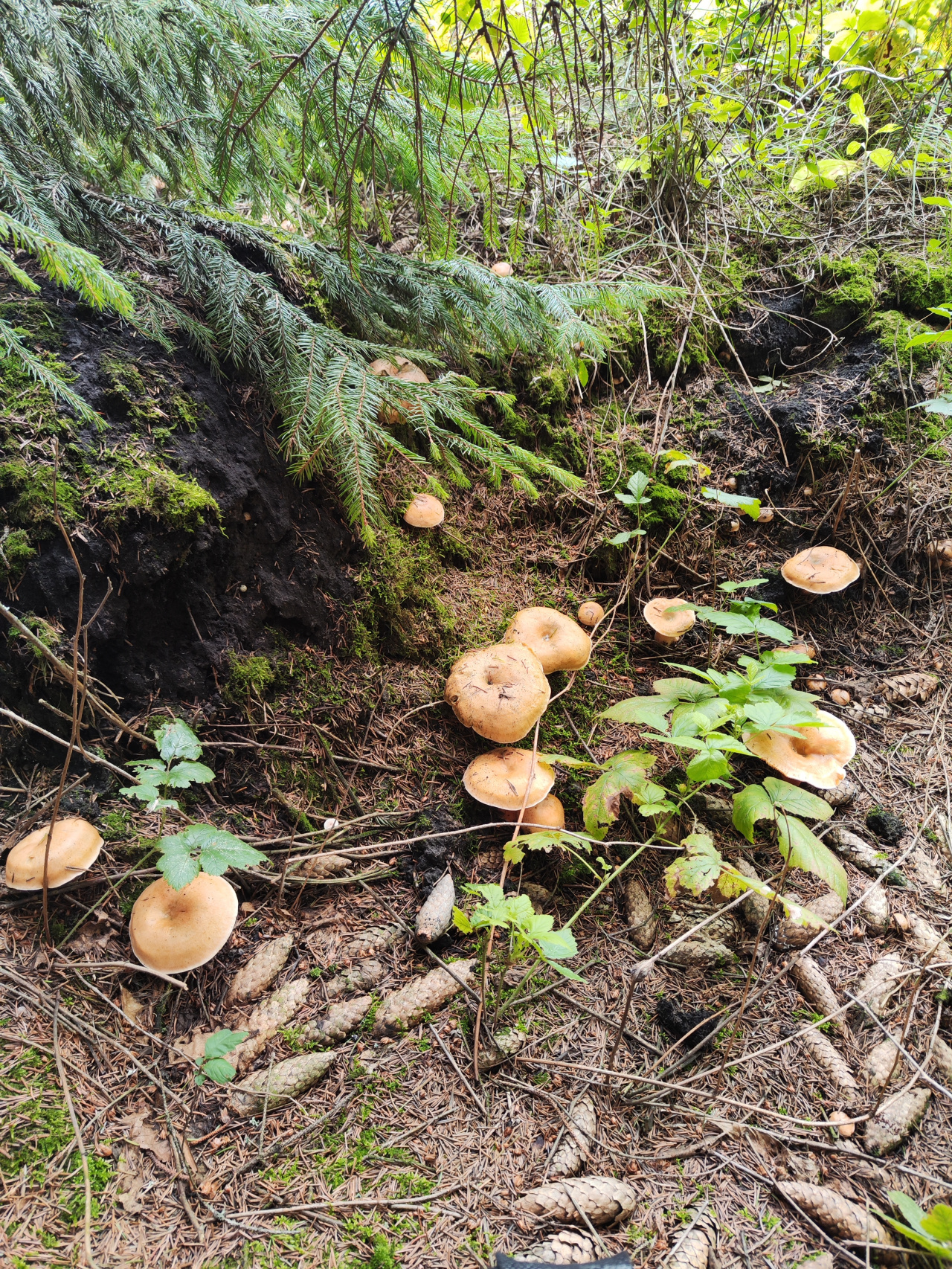 Описание гриба: Место сбора: ельник, хвойная подстилка, моховая подстилка. Гриб ближе к светло-коричневому, есть намеки на круги. Хрупкая шляпка, полая ножка. На шляпке есть зеленоватые зоны. Пластинчатый, пластины почти оранжевые, но с розоватым подтоном. Запах приятный грибной, чуть специевый, не ярко выражен. Окрасил нож и руки в оранжевый цвет. Полежав в воде грибы по краю позеленели. Определила как еловый рыжик, но смущает нехарактерный рост большими семейками, расположенными рядами.