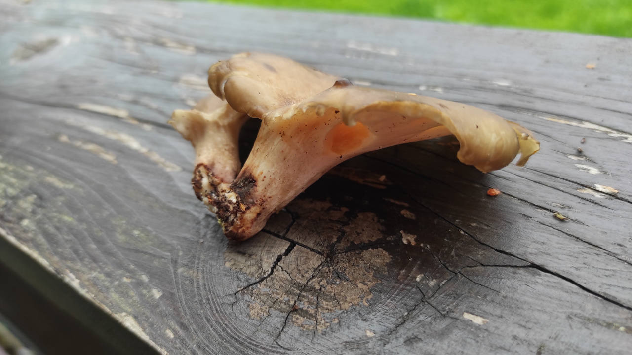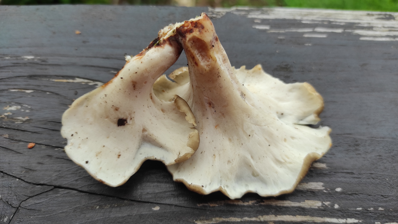 Описание гриба: Рос на остатках дерева. Вид дерева уже не определить. Запах грибной, слегка сладковатый, чем то отдалённо напоминающий запах трутовика. Приятный запах. Решила что вешенка, но изнутри нет пластинок.